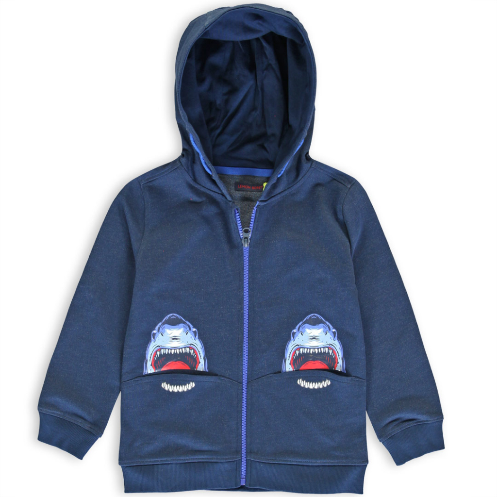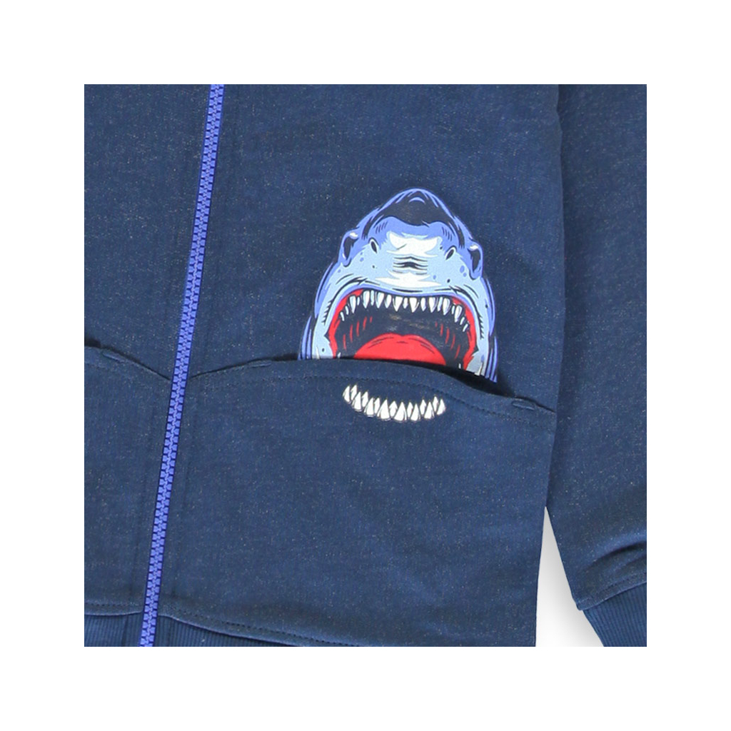 Rozopínacia chlapčenská mikina s kapucňou. Super potlač žralokov vykúkajúcich z vreciek. Teplákovina na rube bez chĺpku.Dodatočné parametre