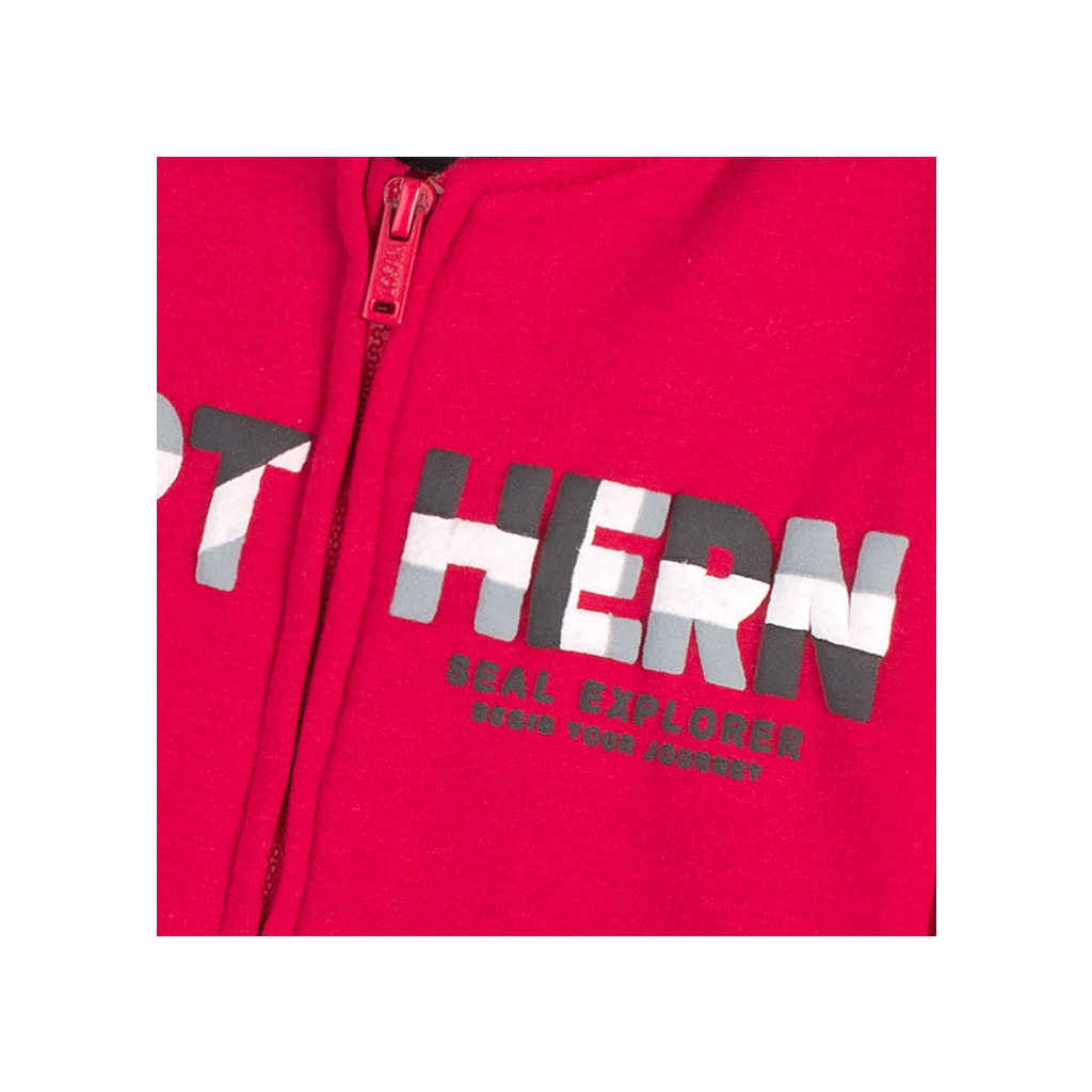Chlapčenská mikina s kapucňou. Plastická penová potlač, našité vrecká, kapucňa podšitá bavlneným úpletom. Teplákovina na rube s jemným chĺpkom.Dodatočné parametre