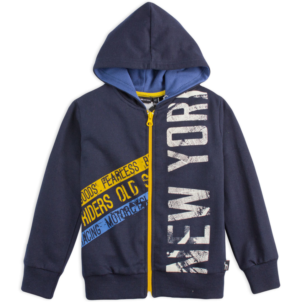Chlapčenská mikina na zips, s kapucňou. Vpredu nápisy. Príjemná teplákovina, na rube jemný chĺpok.Dodatočné parametre