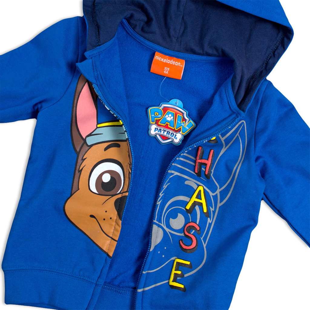 Detská mikina s veľkým obrázkom Chase z Labkovej patroly. S kapucňou, na zips, s pružnými patentami. Pružná teplákovina s jemným chĺpkom.