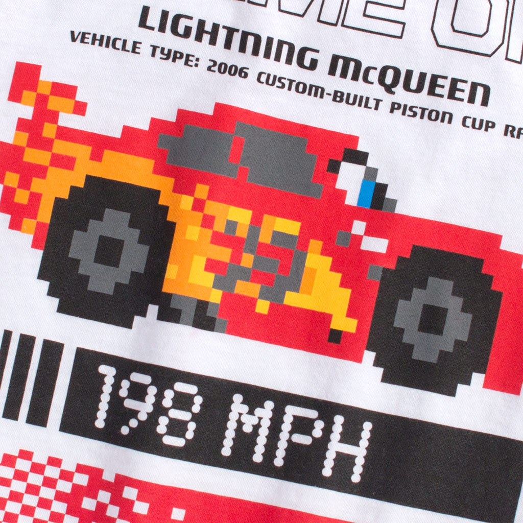 Letná súprava pre chlapcov. Tričko s krátkym rukávom, šortky s vreckami, v páse na gumu, so šnúrkou na stiahnutie. Potlač s motívom Blesku McQueena.