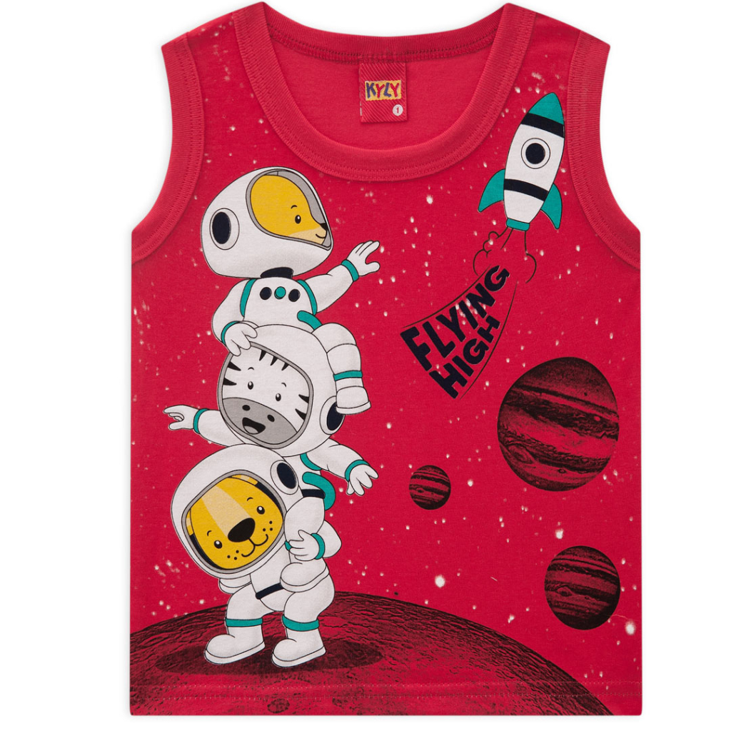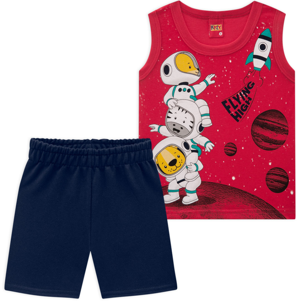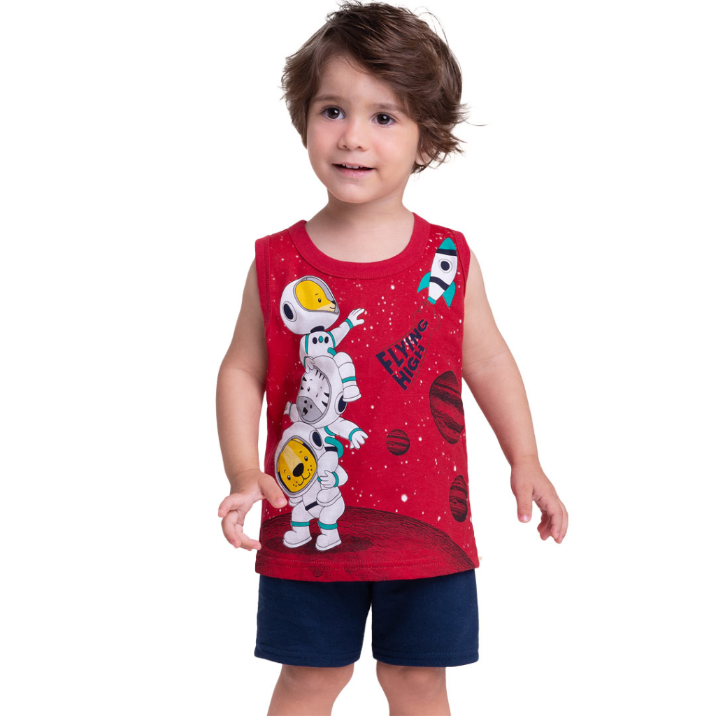 Letná chlapčenská súprava. Tričko bez rukávov, s potlačou na prednom diele. Jednofarebné šortky, v páse na gumu. Vyrobené v Brazílii.Dodatočné parametre