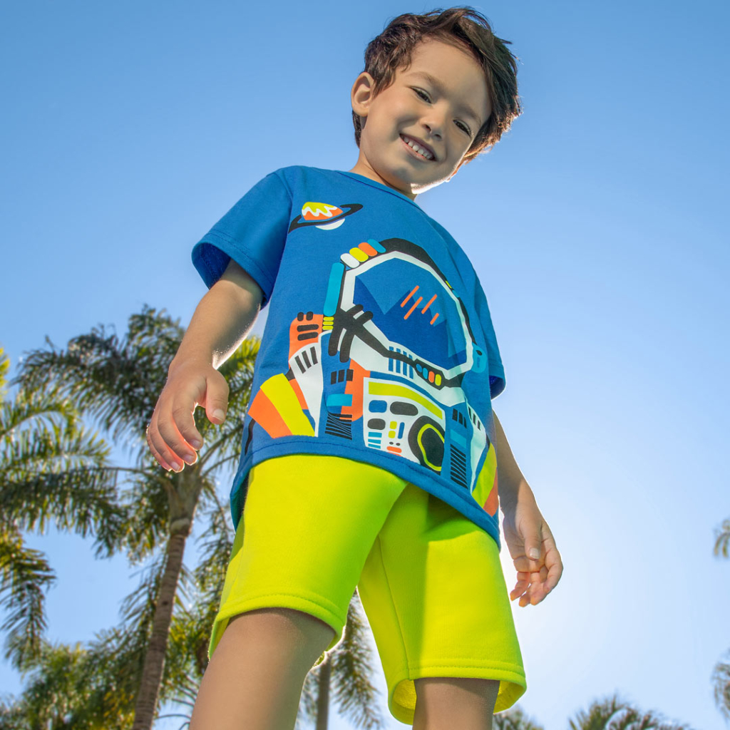Letná súprava pre chlapcov. Tričko s krátkym rukávom, s potlačou. Jednofarebné šortky z teplákoviny, na rube bez chĺpku. Vyrobené v Brazílii.Dodatočné parametre