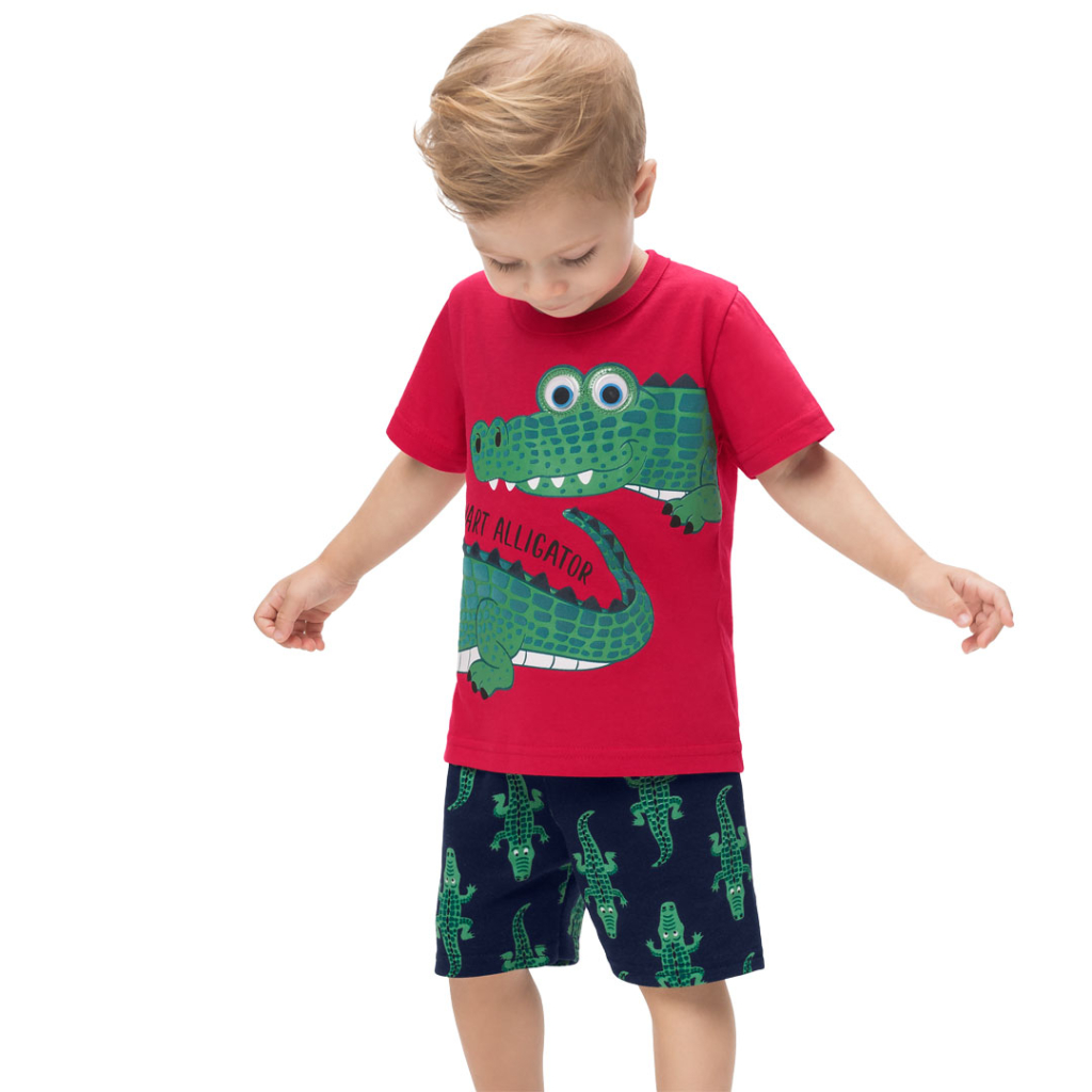 Letná súprava pre chlapcov. Tričko s krátkym rukávom, šortky v páse na gumu. Motív krokodíla. Vyrobené v Brazílii.Dodatočné parametre
