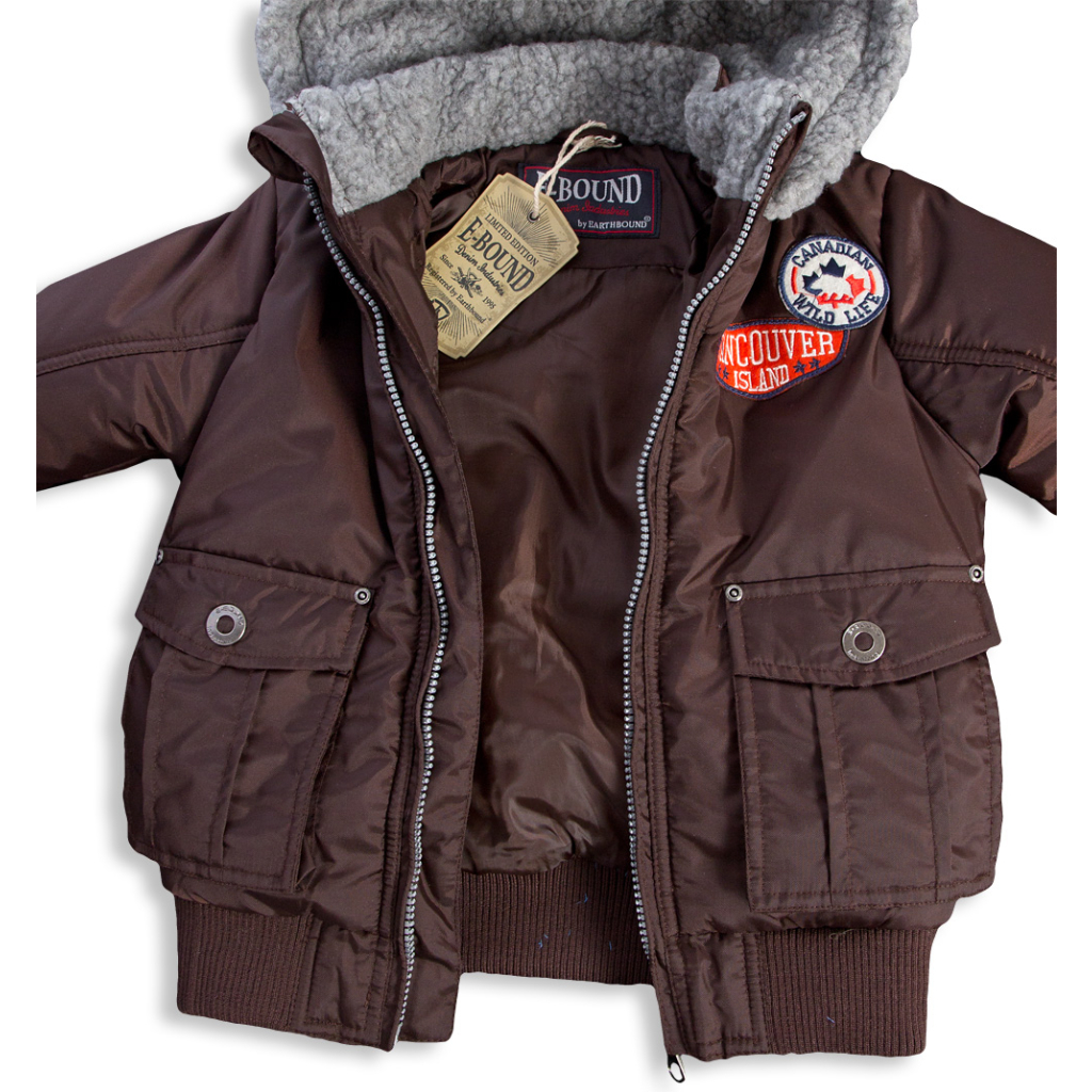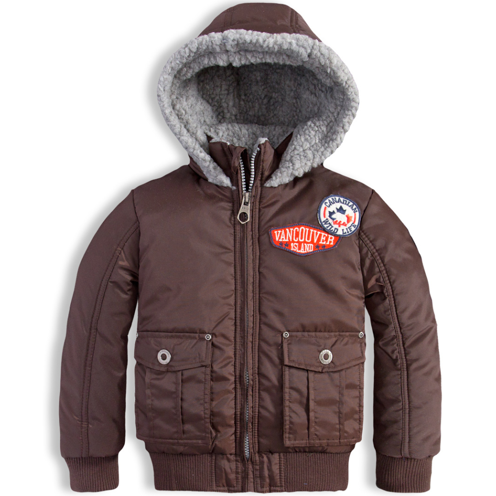 Chlapčenská zimná bunda, strih bomber. Kapucňa a stojačik podšité kožušinkou. Našité vrecká. Pružné patenty. Šuštiaková podšívka.Dodatočné parametre