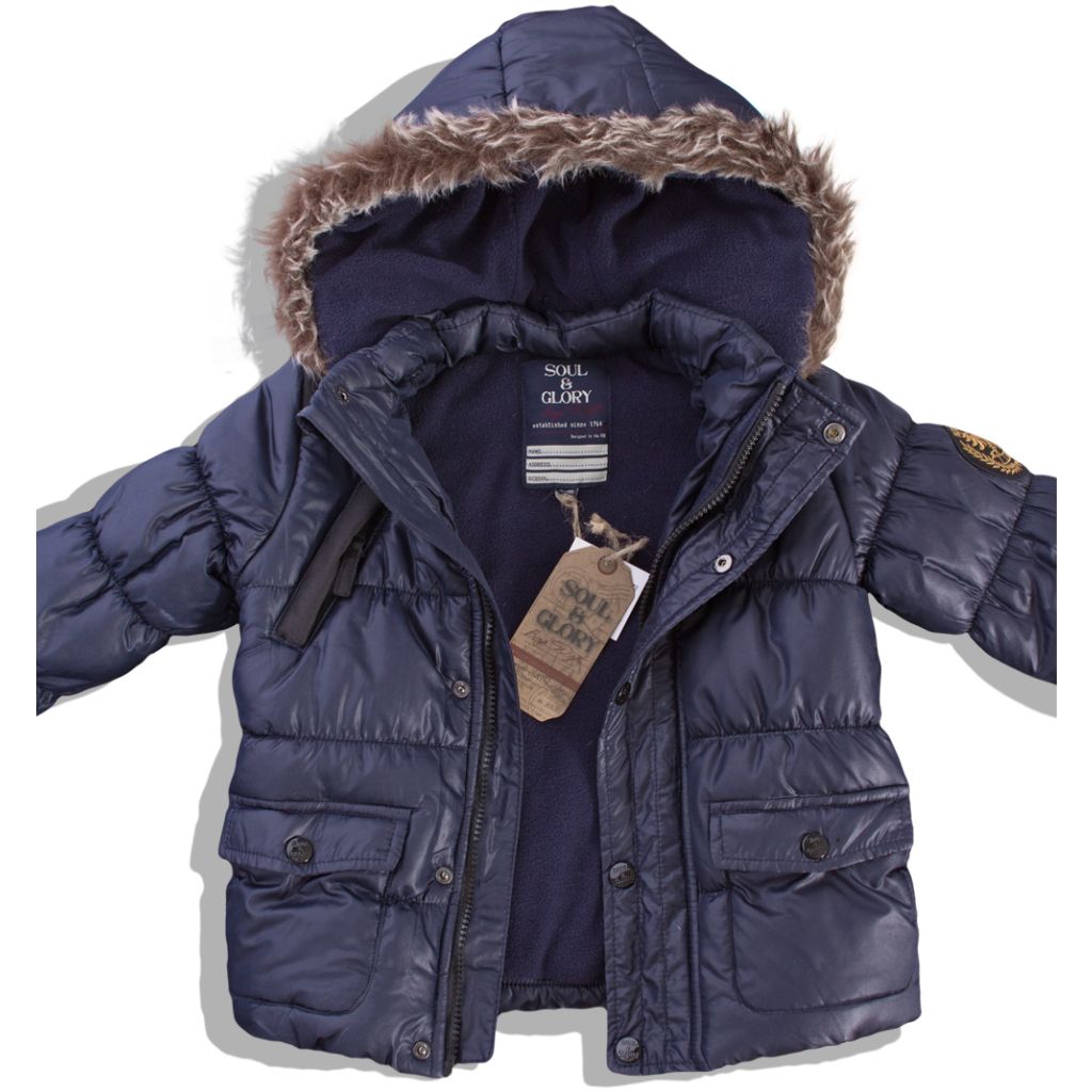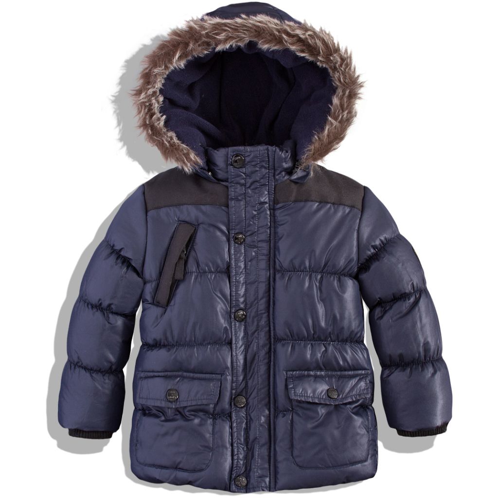 Chlapčenská zimná bunda s odopínateľnou kapucňou. Zapínanie na zips a patentky. Na lakťoch našité záplaty, nášivka na ramene. Podšívka z hrejivého flísu. Rukávy zakončené patentom.Dodatočné parametre