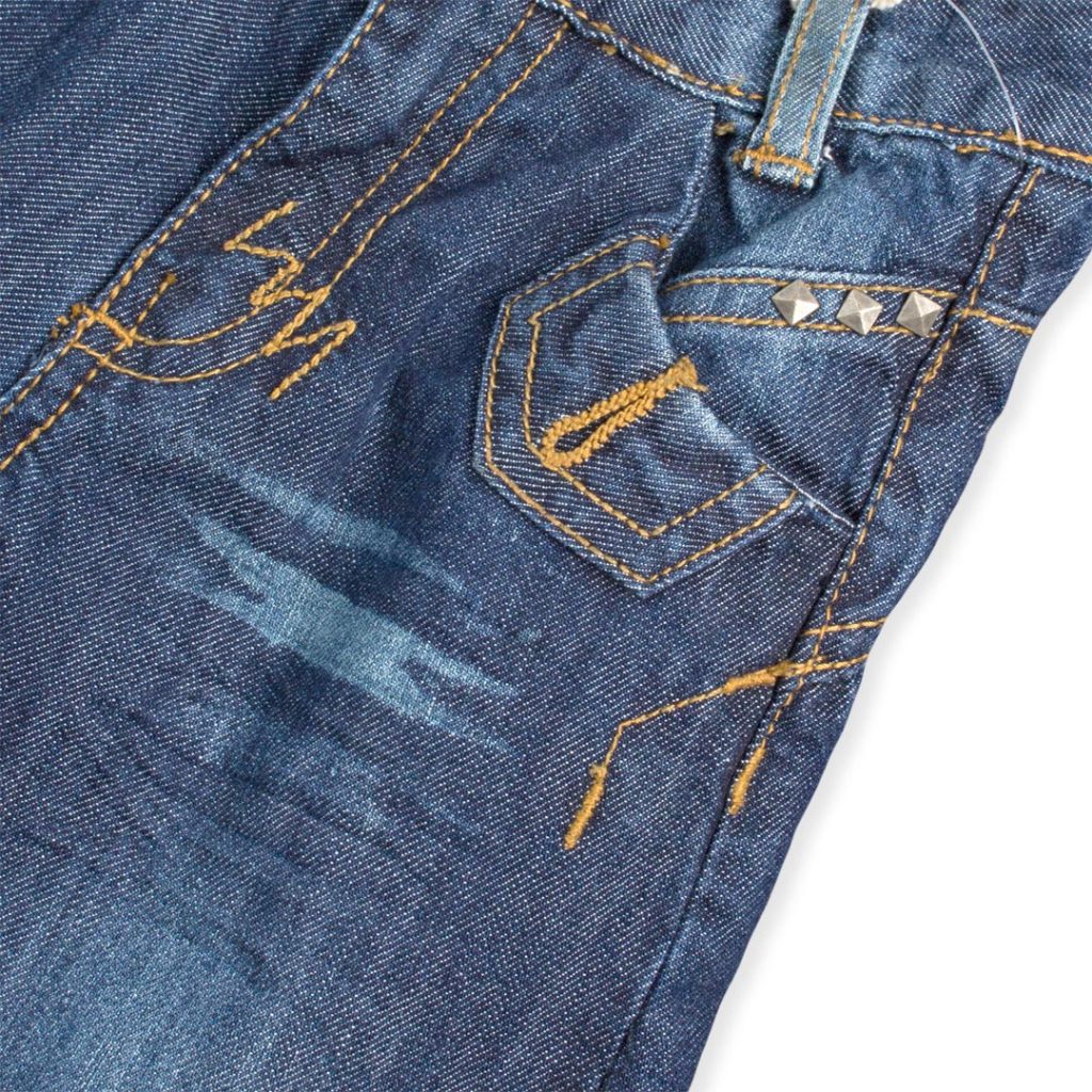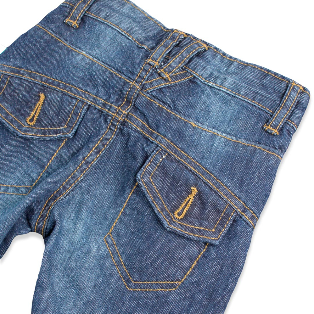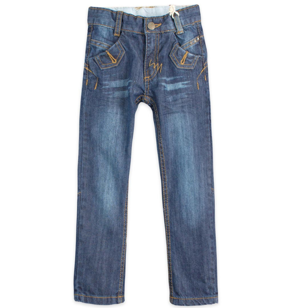 Chlapčenské džínsy z tmavo modrého denimu. Zapínanie na zips a gombík, v páse sťahovacia guma. Vpredu funkčné vrecká s ozdobnými detailmi, vzadu vrecká falošné.Dodatočné parametre
