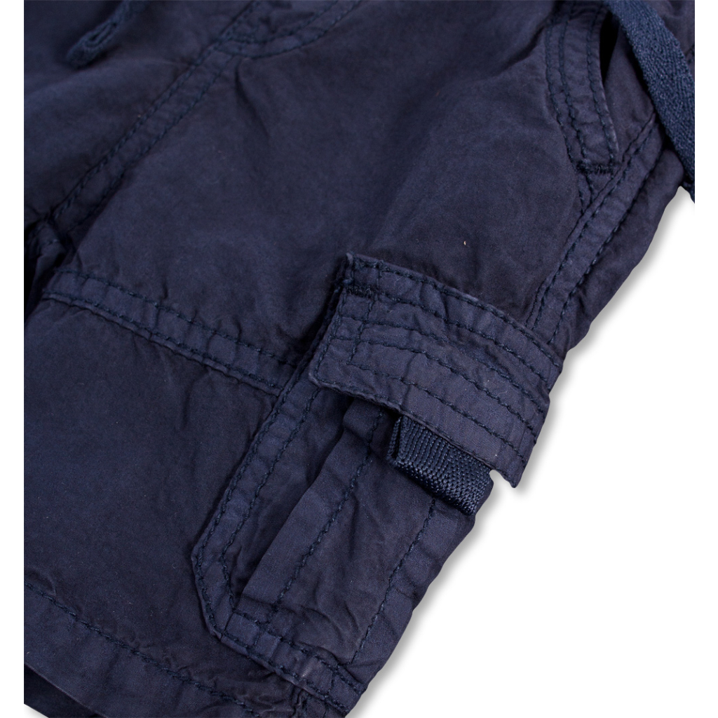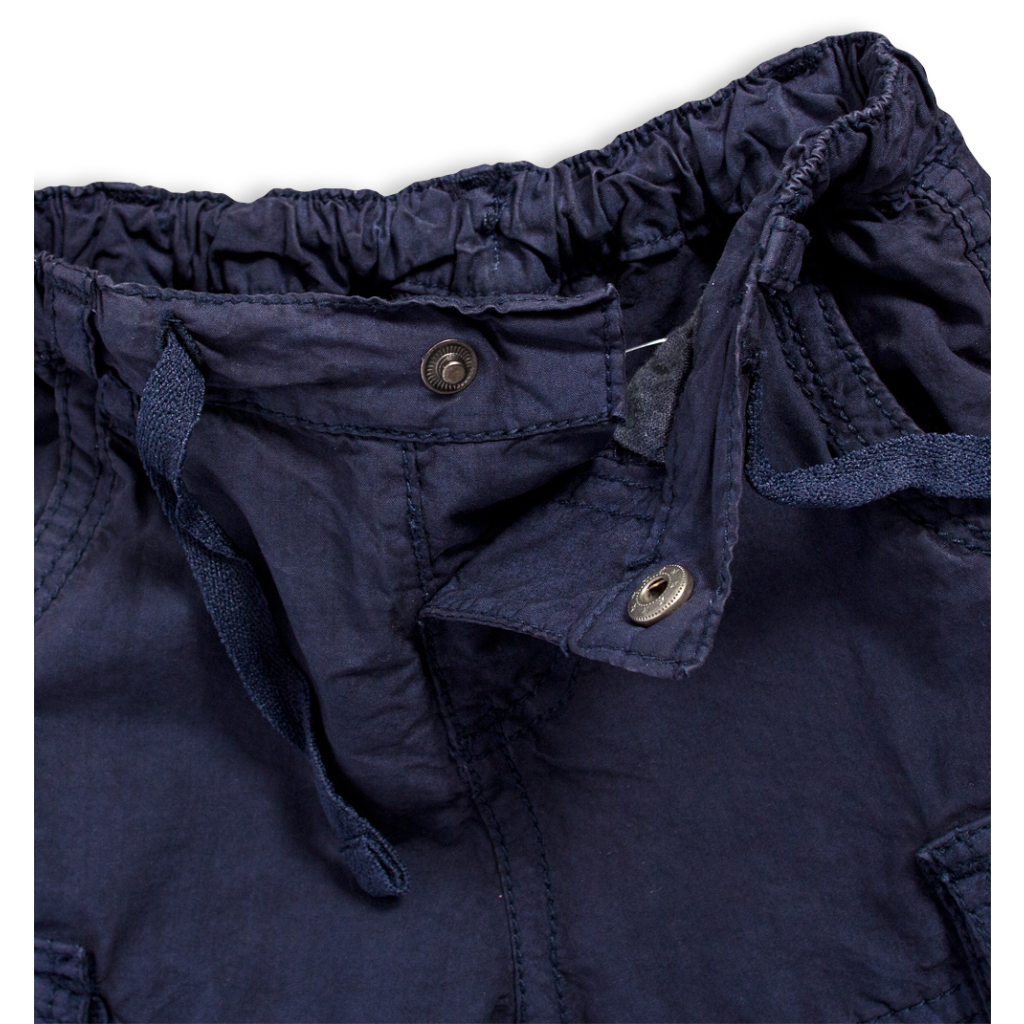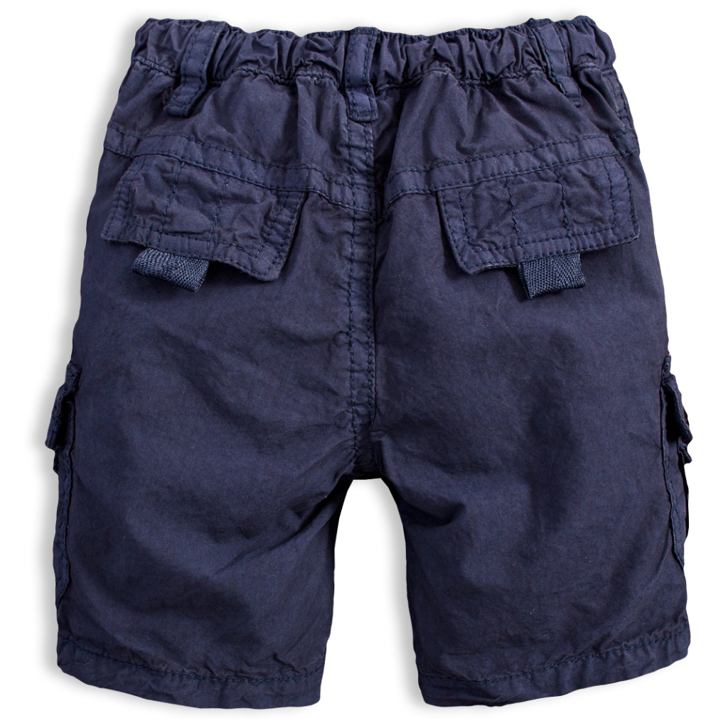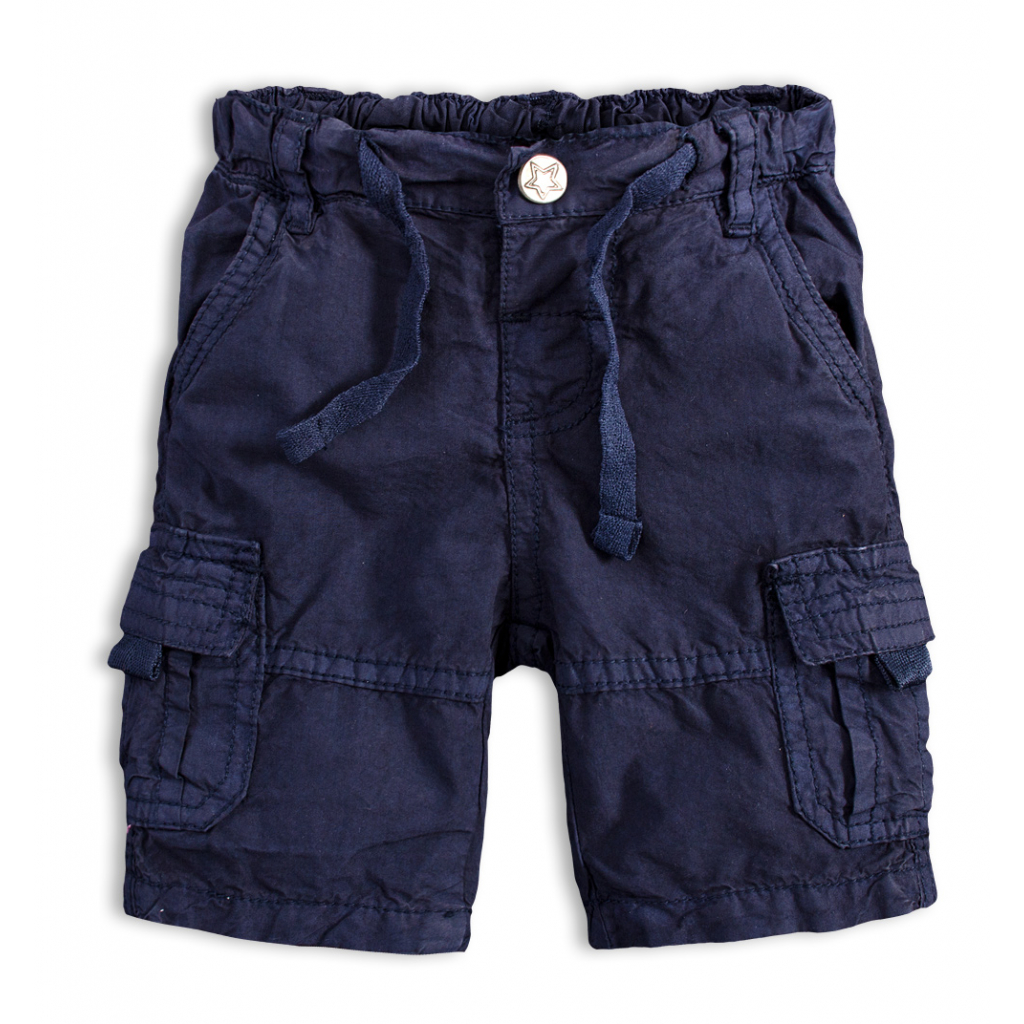 Detské šortky z tmavo modrého plátna. V páse patent, šnúrka na stiahnutie. Vpredu funkčné vrecká, vzadu falošné. Príjemný materiál.Dodatočné parametre