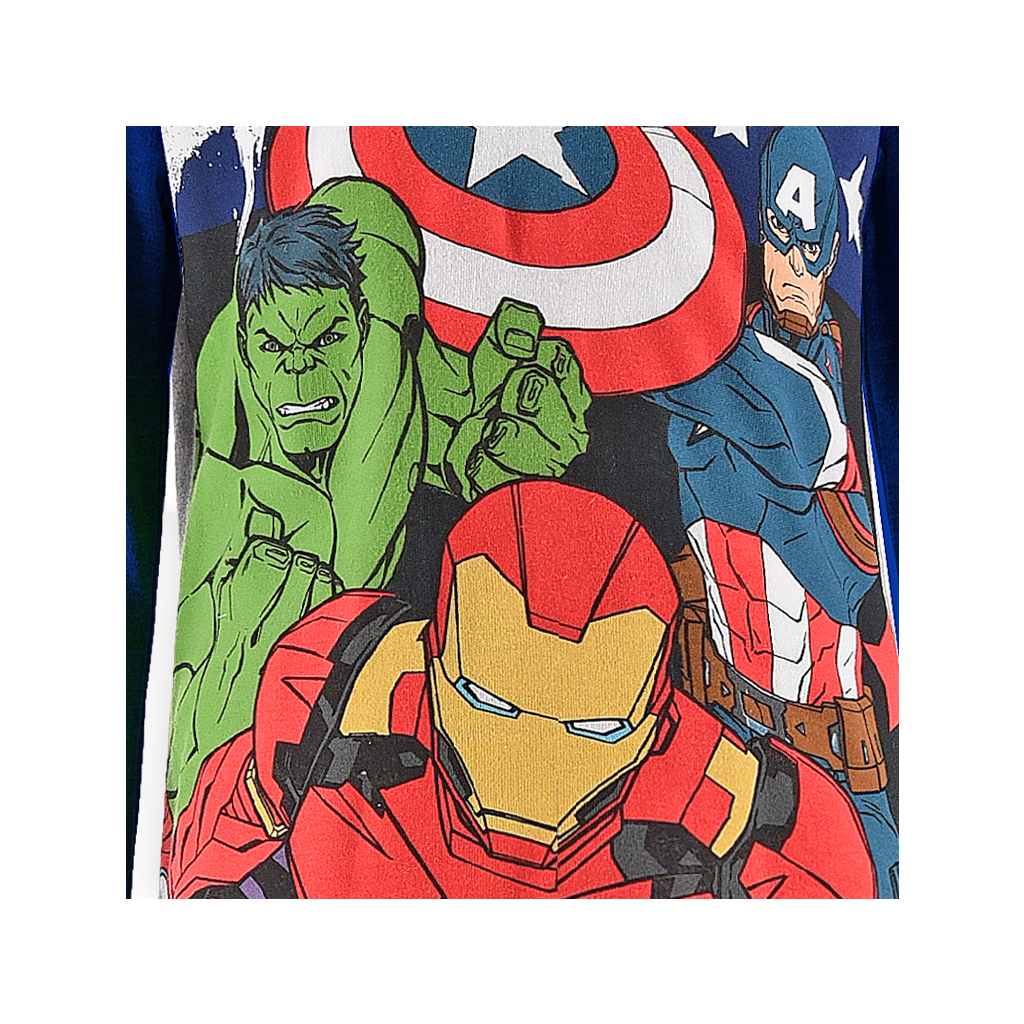 Chlapčenské pyžamo Avengers z hrubšieho, bavlneného úpletu. Vrchný diel s veľkou potlačou Avengers, pri krku dva gombíky. Nohavice jednofarebné. Rukávy a nohavice ukončené patentom.Dodatočné parametre