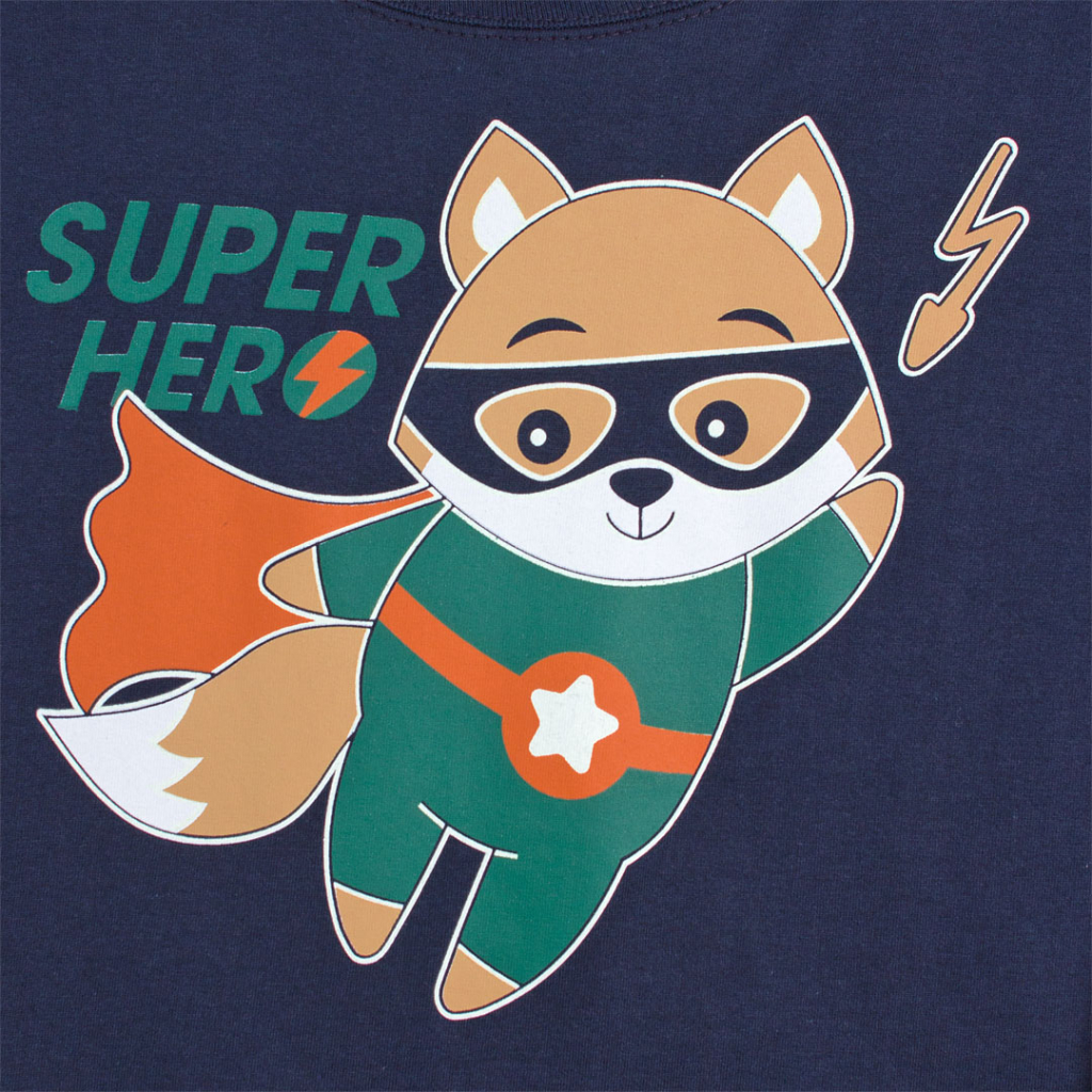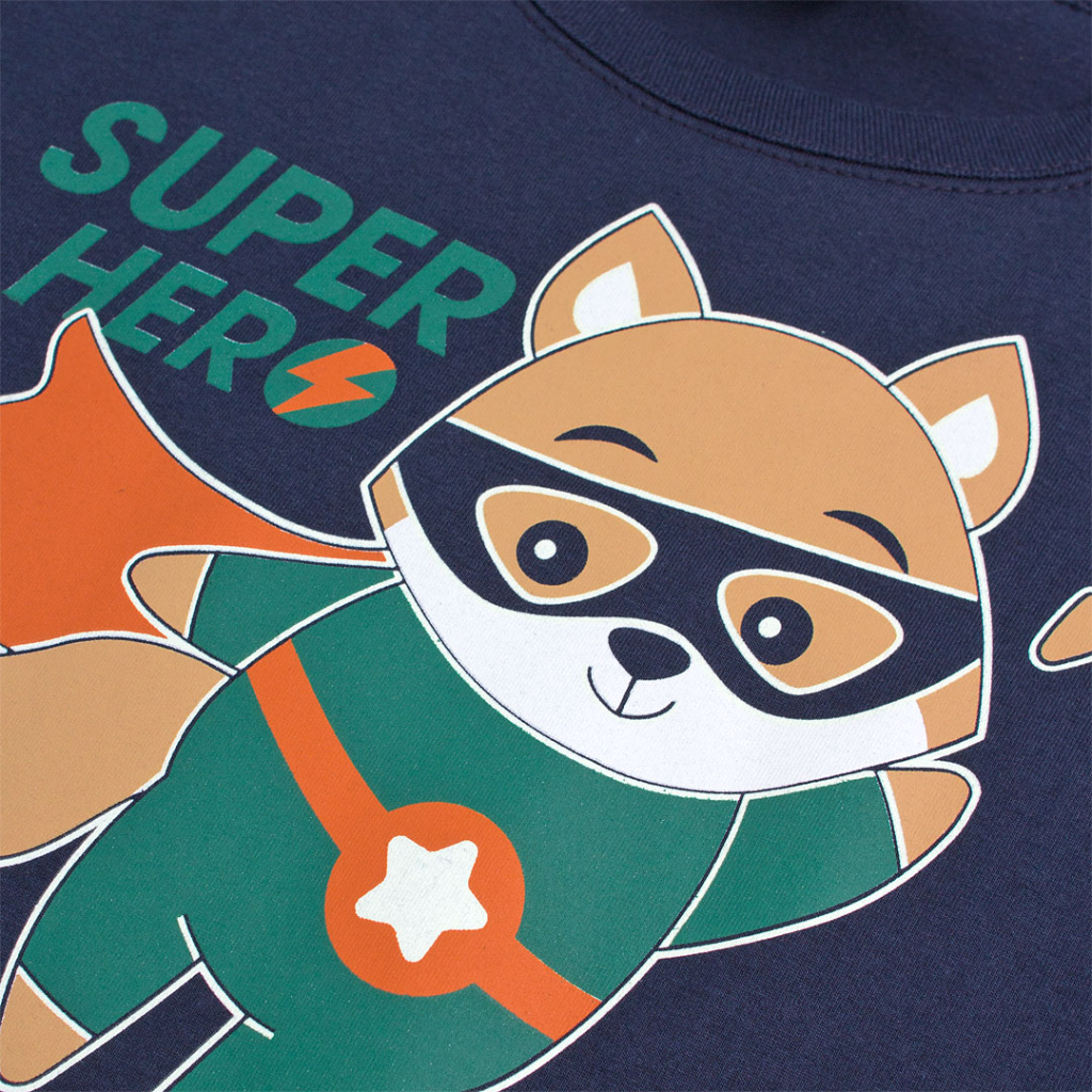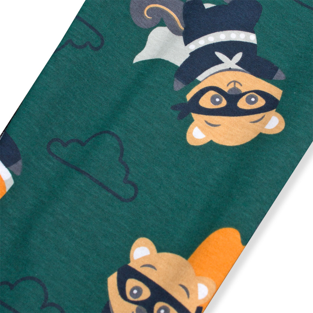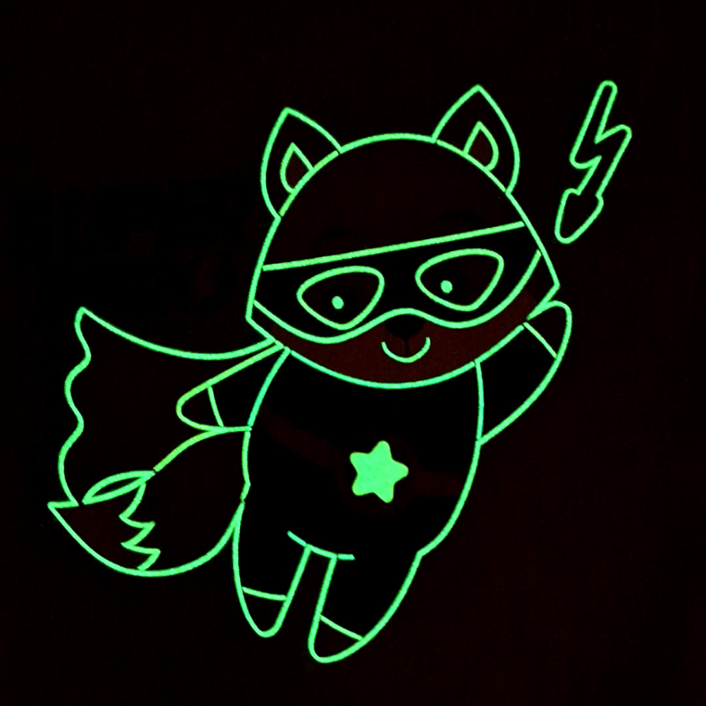 Chlapčenské pyžamo s mývalom - superhrdinom. Dlhé rukávy i nohavice. Obrysy obrázku na tričku v tme svietia. Vyrobené v Brazílii.