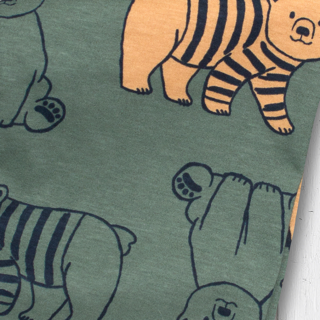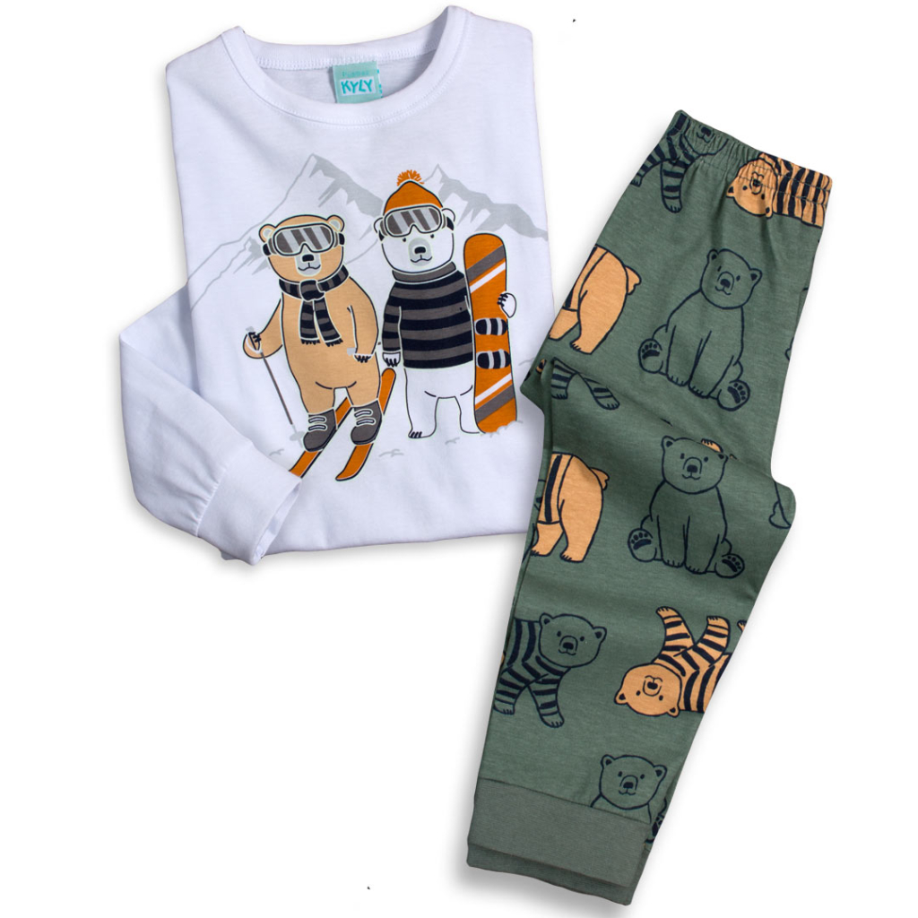 Chlapčenské pyžamo s potlačou. Obrysy medveďov na tričku v tme svietia. Dlhé rukávy i nohavice, pružné patenty. Vyrobené v Brazílii.Dodatočné parametre