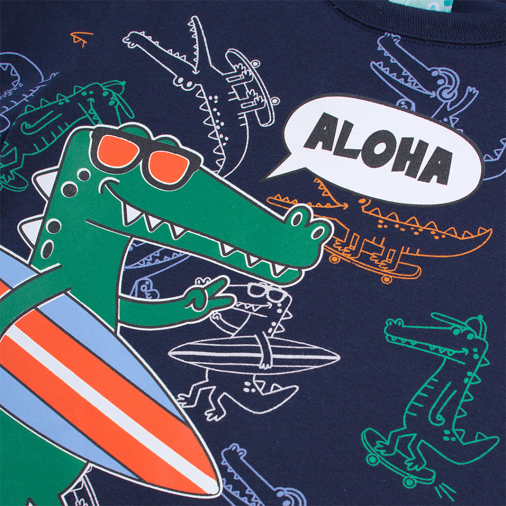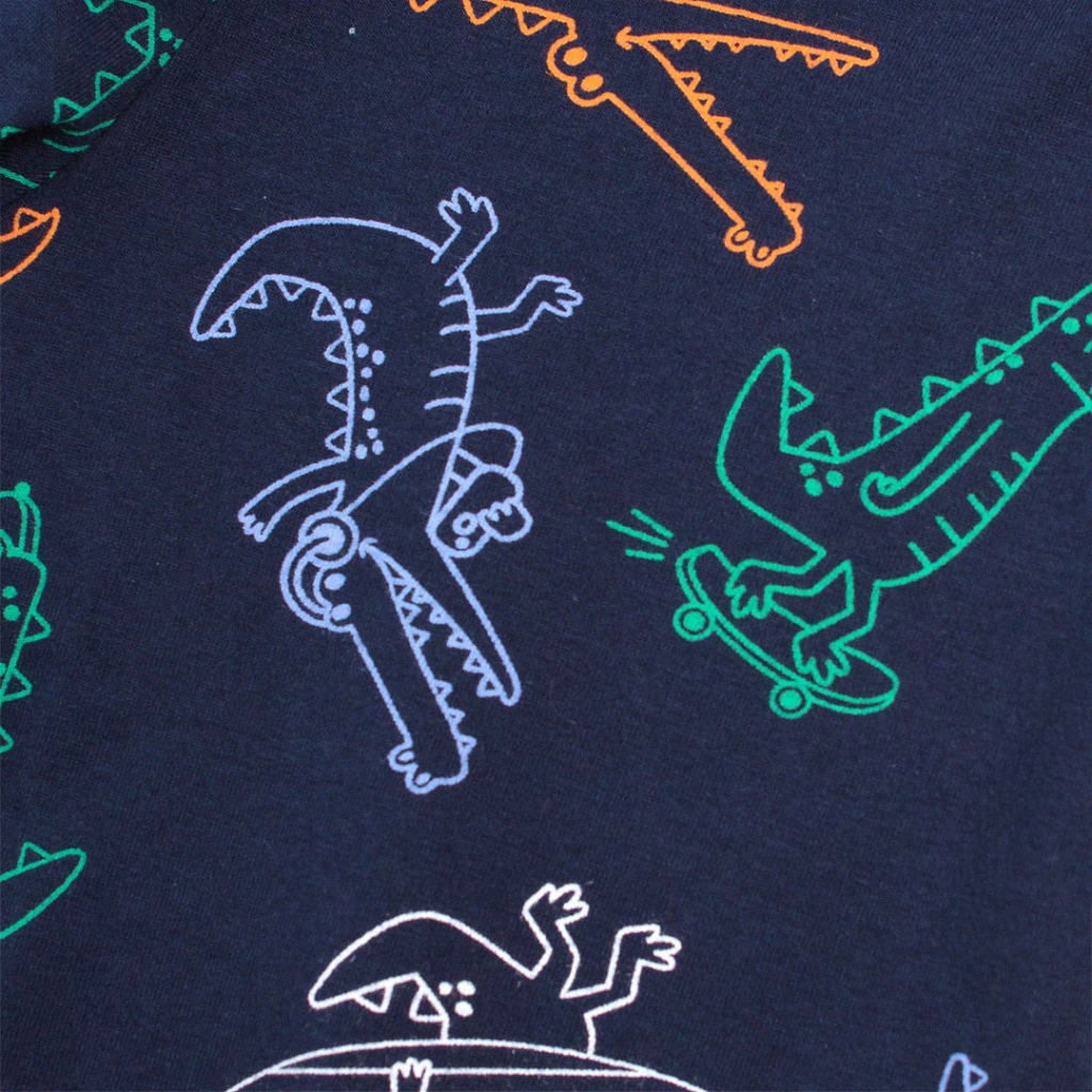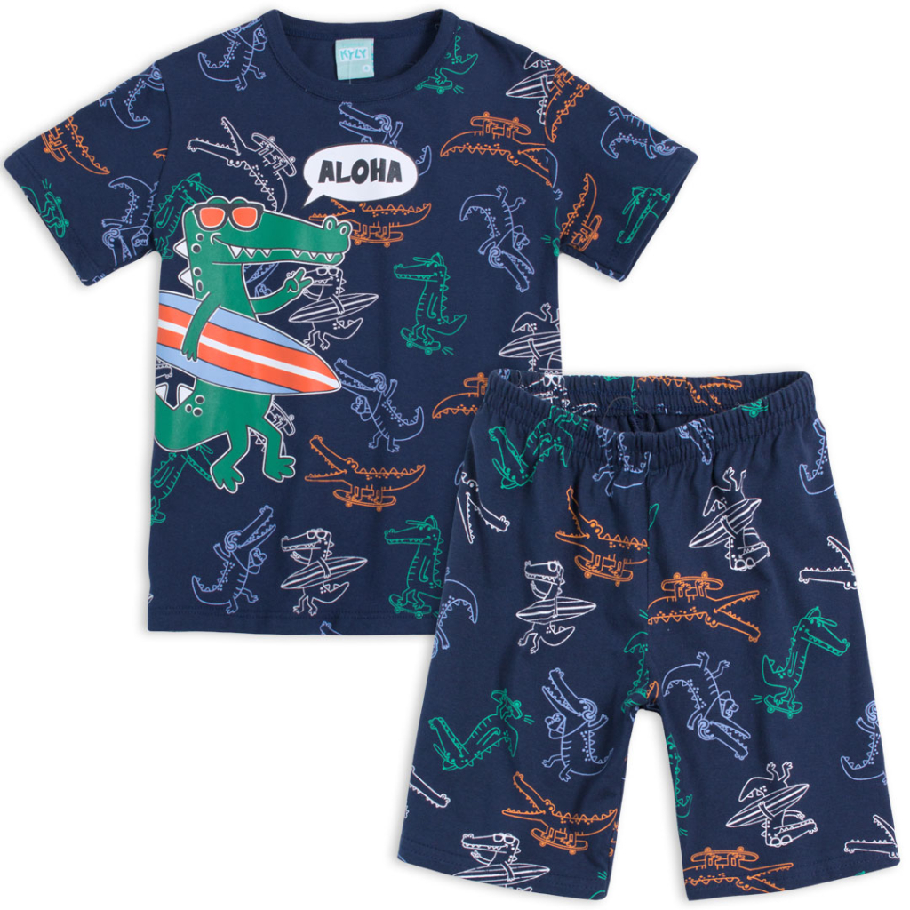 Pyžamo s veselou potlačou pre chlapcov. Obrysy veľkého obrázku na tričku v tme svietia. Pohodlné šortky. Príjemný bavlnený úplet. Vyrobené v Brazílii.Dodatočné parametre