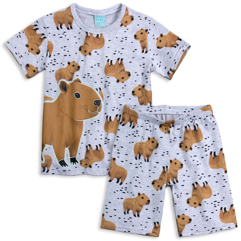 Chlapčenské pyžamko s veselou kapybarou. Obrysy obrázka na tričku v tme jemne svietia a svetielko postupne slabne a zhasína. Mäkký bavlnený úplet z kvalitnej, veľmi príjemnej bavlny. Vyrobené v Brazílii.