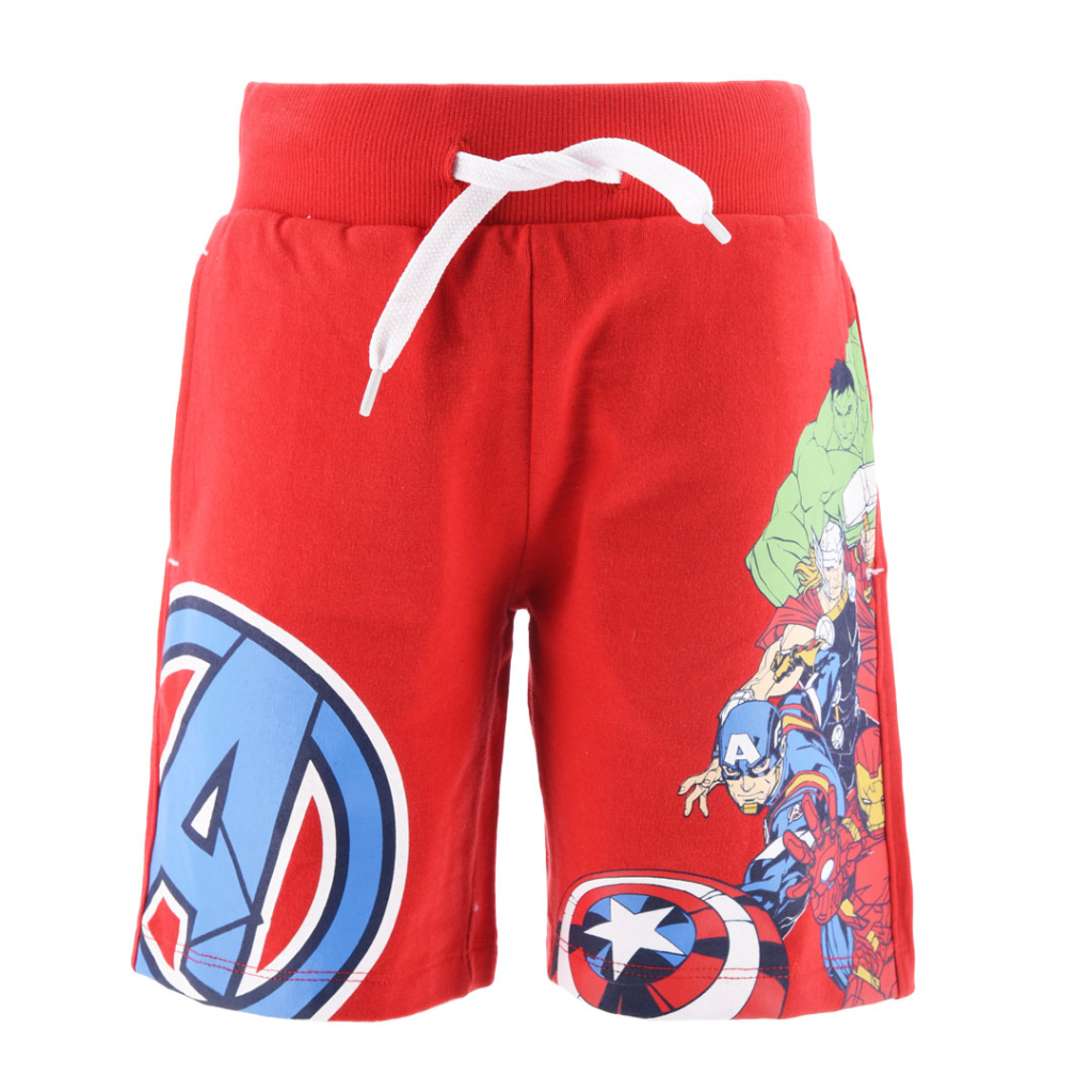 Chlapčenské kraťasy z bavlneného úpletu s potlačou Avengers. V páse guma, šnúrka na stiahnutie. Na bokoch vrecká. Teplákovina na rube bez chĺpku.Dodatočné parametre