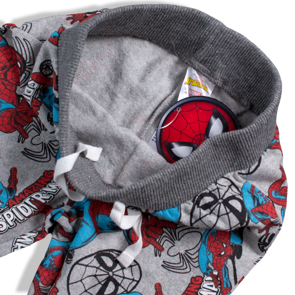 Chlapčenské tepláky s motívom Spidermana. Pružný patent na nohaviciach, v páse guma, šnúrka iba ozdobná. Na rube jemný chĺpok.Dodatočné parametre