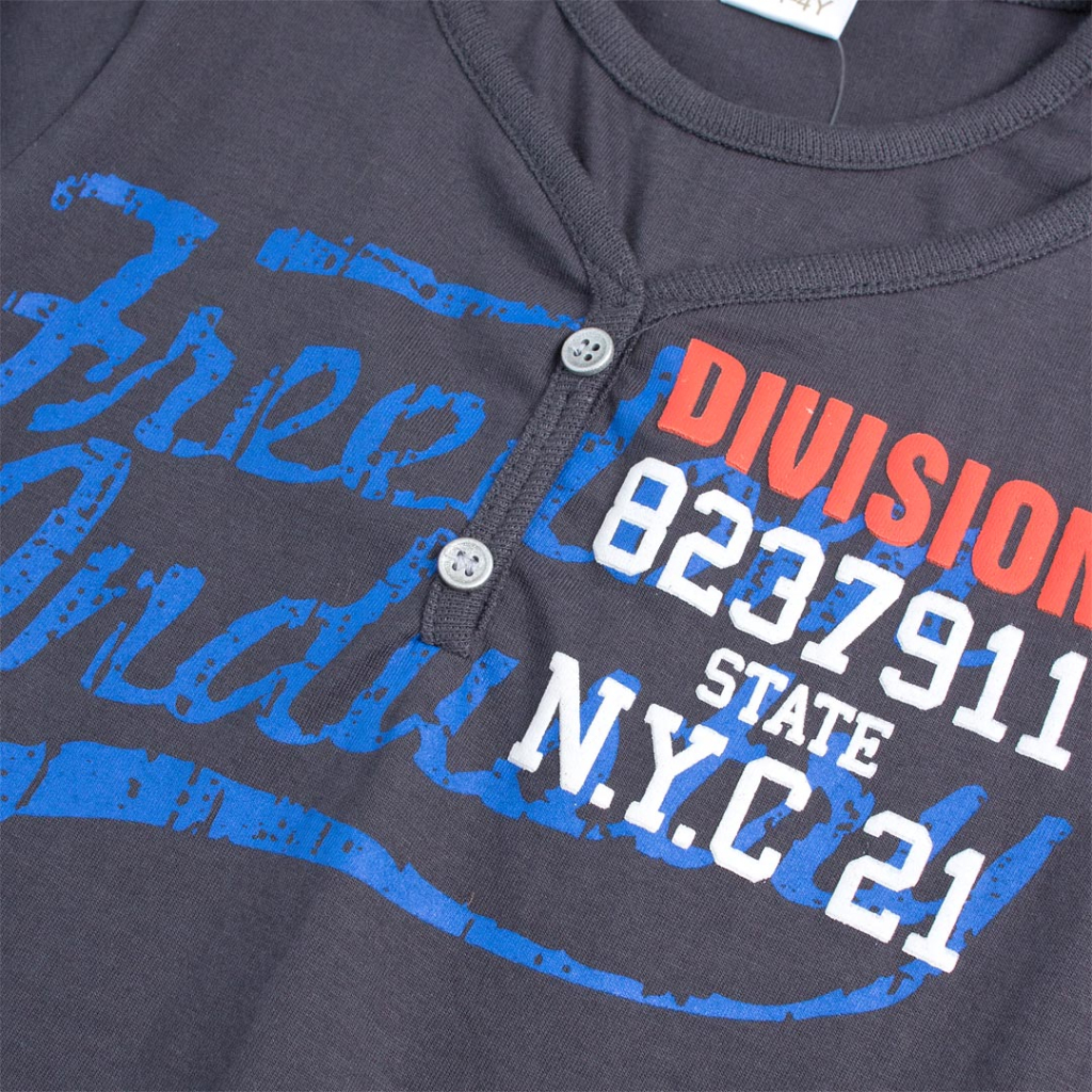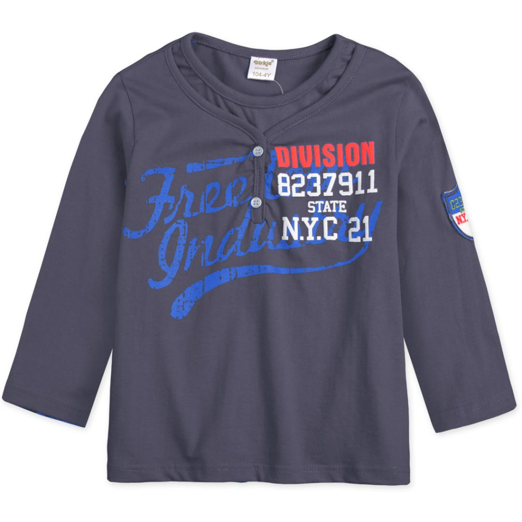 Chlapčenské tričko s dlhým rukávom. S nápisom, ozdobnými gombíkmi a vsadkou vo výstrihu. Mäkký bavlnený úplet.Dodatočné parametre