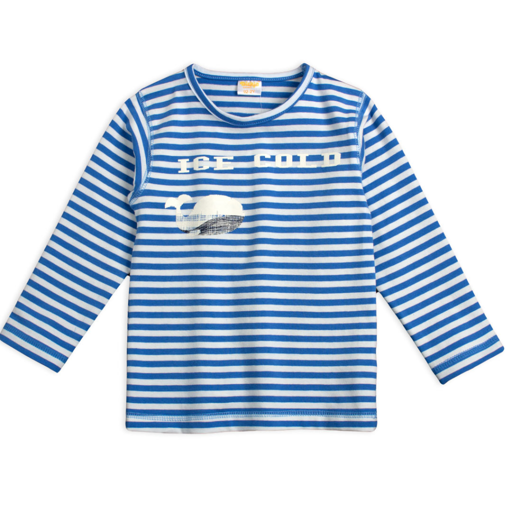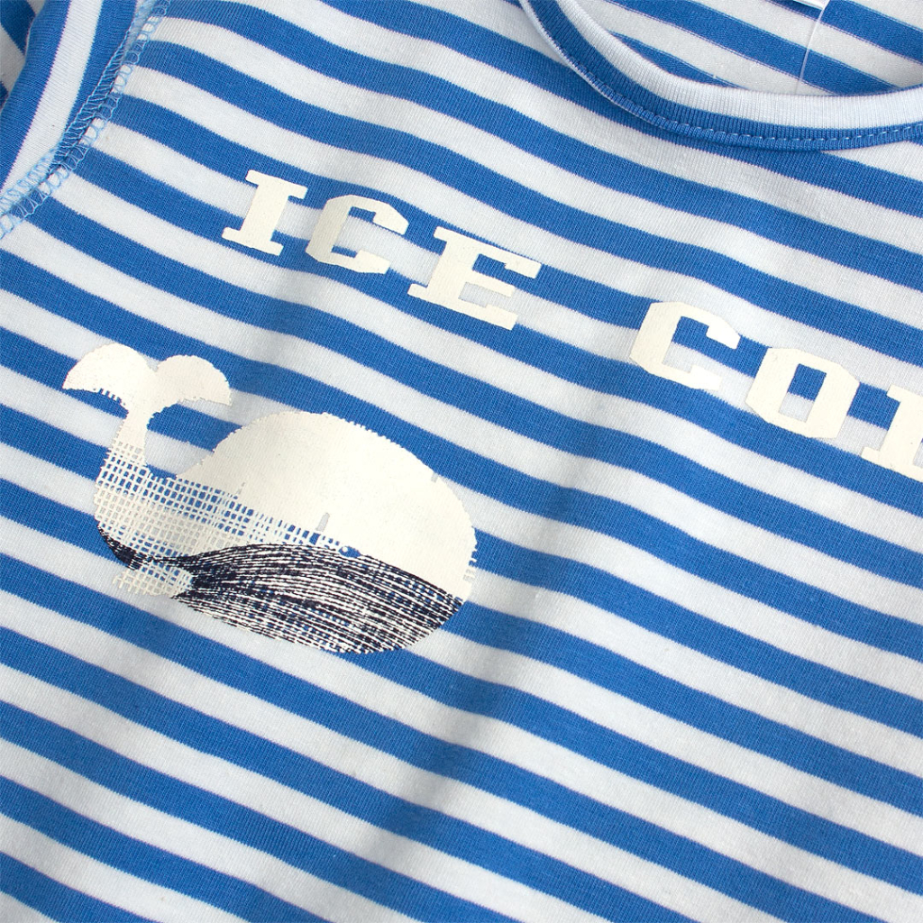 Chlapčenské tričko s dlhým rukávom. Pruhovaný úplet s obrázkom veľryby a nápisom. Na ramene zapínanie na patentky. Materiál je mäkký a pružný.Dodatočné parametre