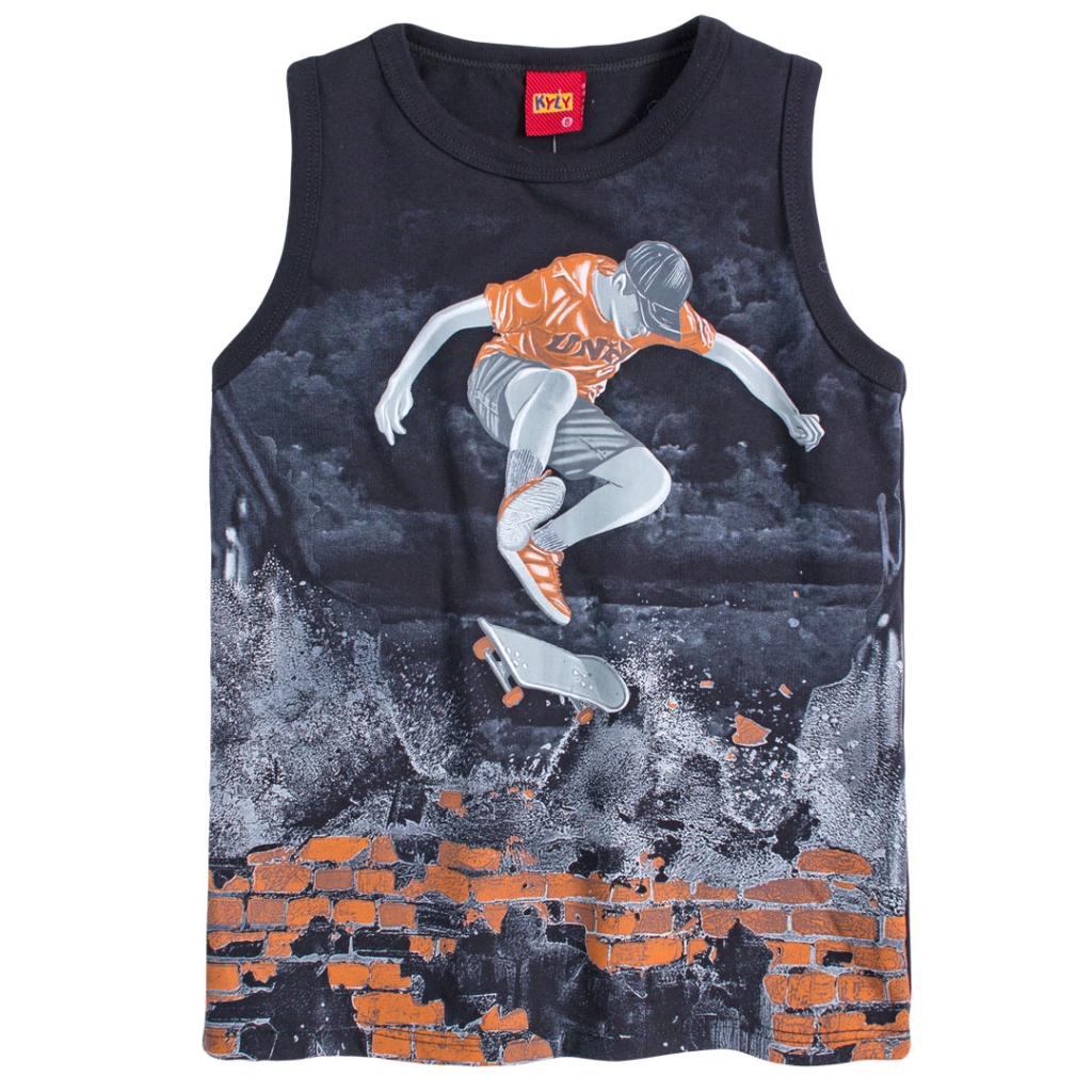 Chlapčenské tričko bez rukávov. Vpredu skateboardový motív, zadný diel jednofarebný. Bavlnený úplet. Vyrobené v Brazílii.Dodatočné parametre