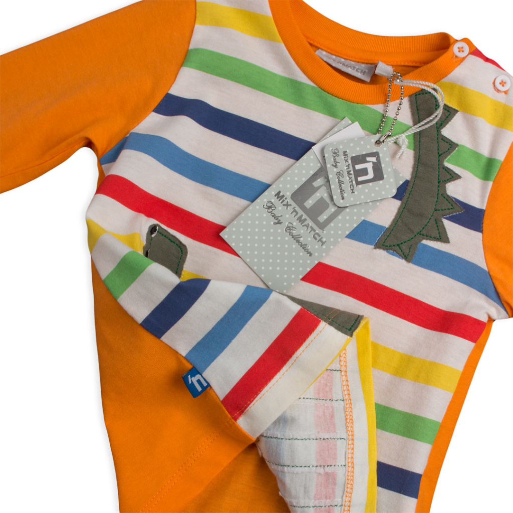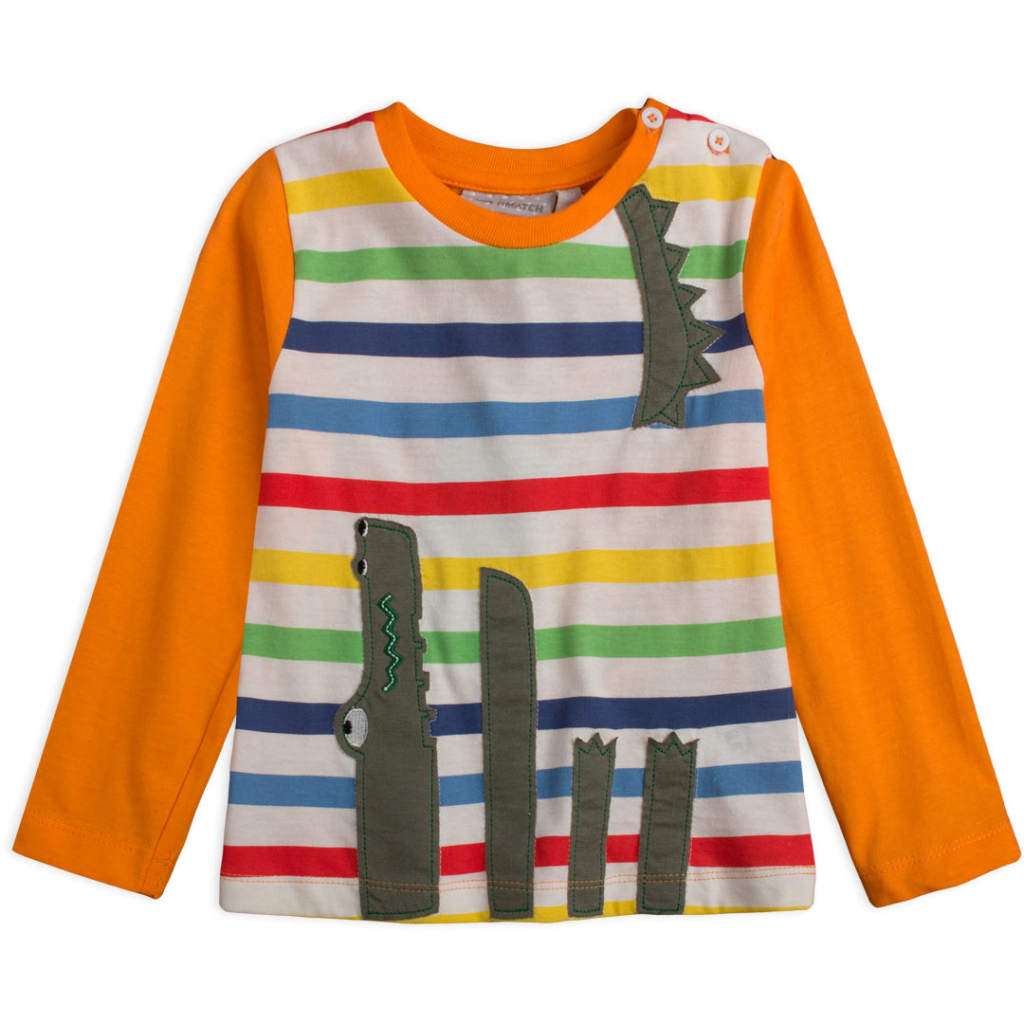 Chlapčenské tričko s dlhým rukávom. Na ramene zapínanie na gombíky. Na prednom diele farebné prúžky a nášivka. Pružný bavlnený úplet.Dodatočné parametre