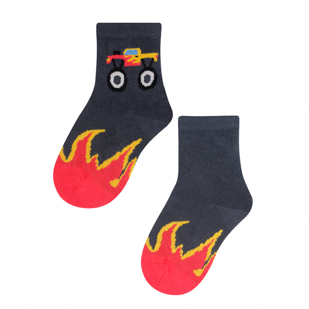 Detské vzorované ponožky s autom a plameňmi. Príjemný elastický materiál, perfektne sedia na nohe, ploché švy. Certifikát OEKOTEX 100. Výrobca WOLA.