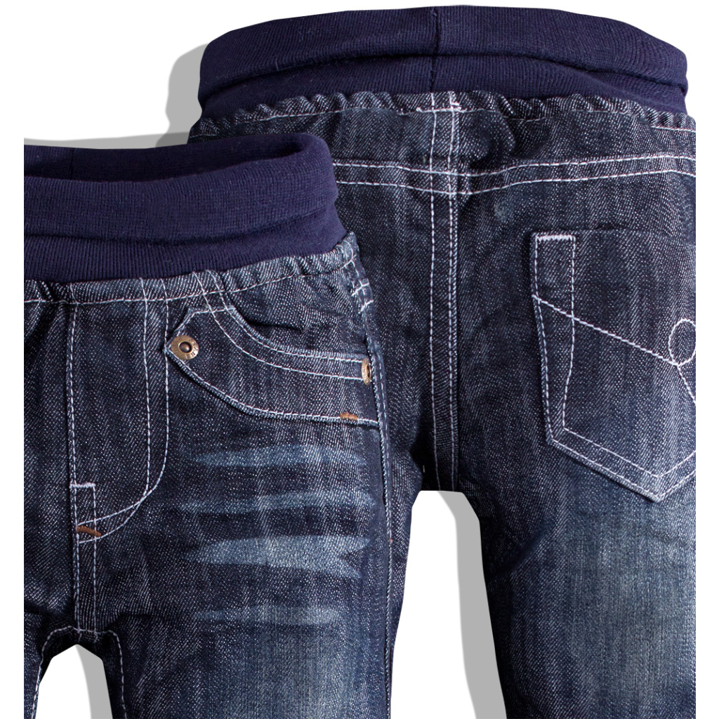 Chlapčenské džínsy s bavlnenou podšívkou. V páse pružný, vyhrňovací patent. Vpredu i vzadu funkčné vrecká, ozdobné svetlé prešívanie.Dodatočné parametre