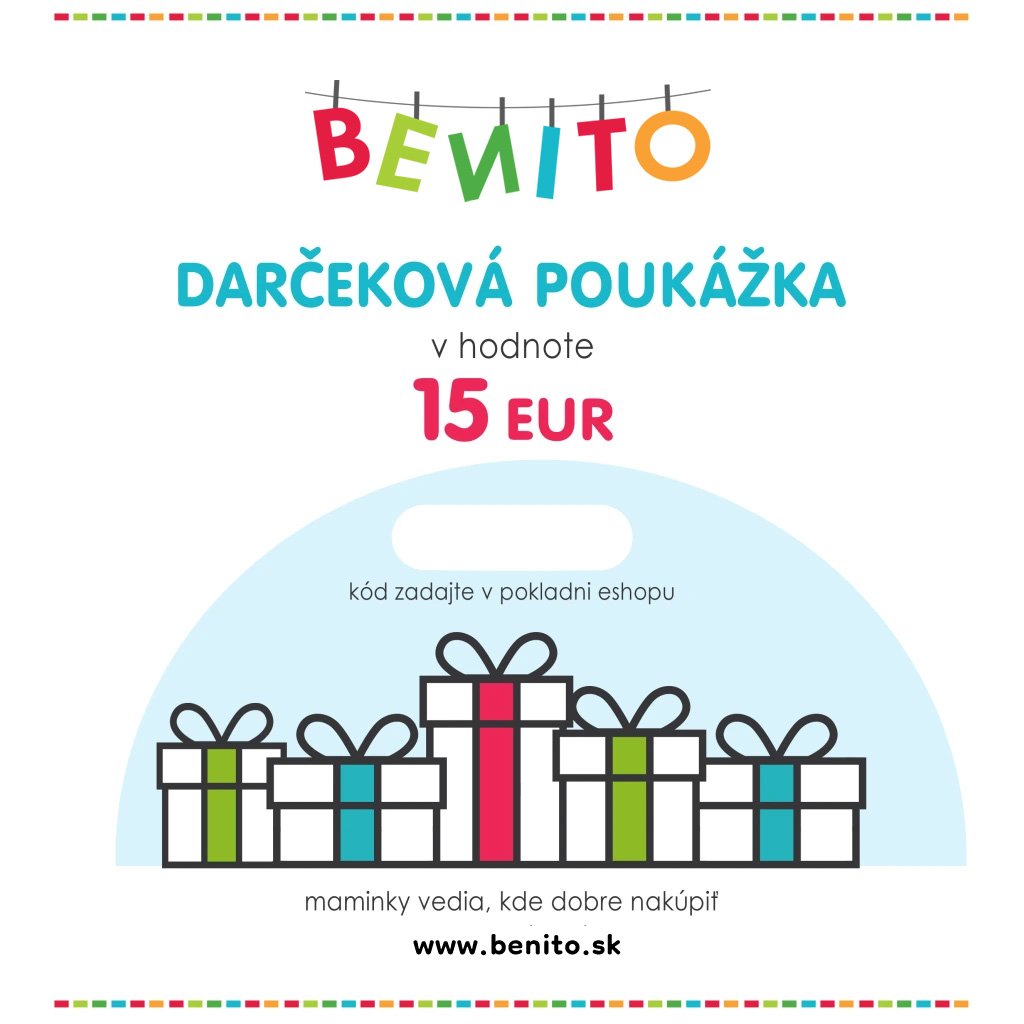 Poukážka na nákup tovaru v hodnote 15 EUR. Každý poukaz má unikátny kód, ktorý je potrebné zadať v pokladni eshopu, po jeho zdaní sa odpočíta celá hodnota darčekovej poukážky z celkovej sumy nákupu. Darčekovú poukážku je možné použiť na jeden nákup.