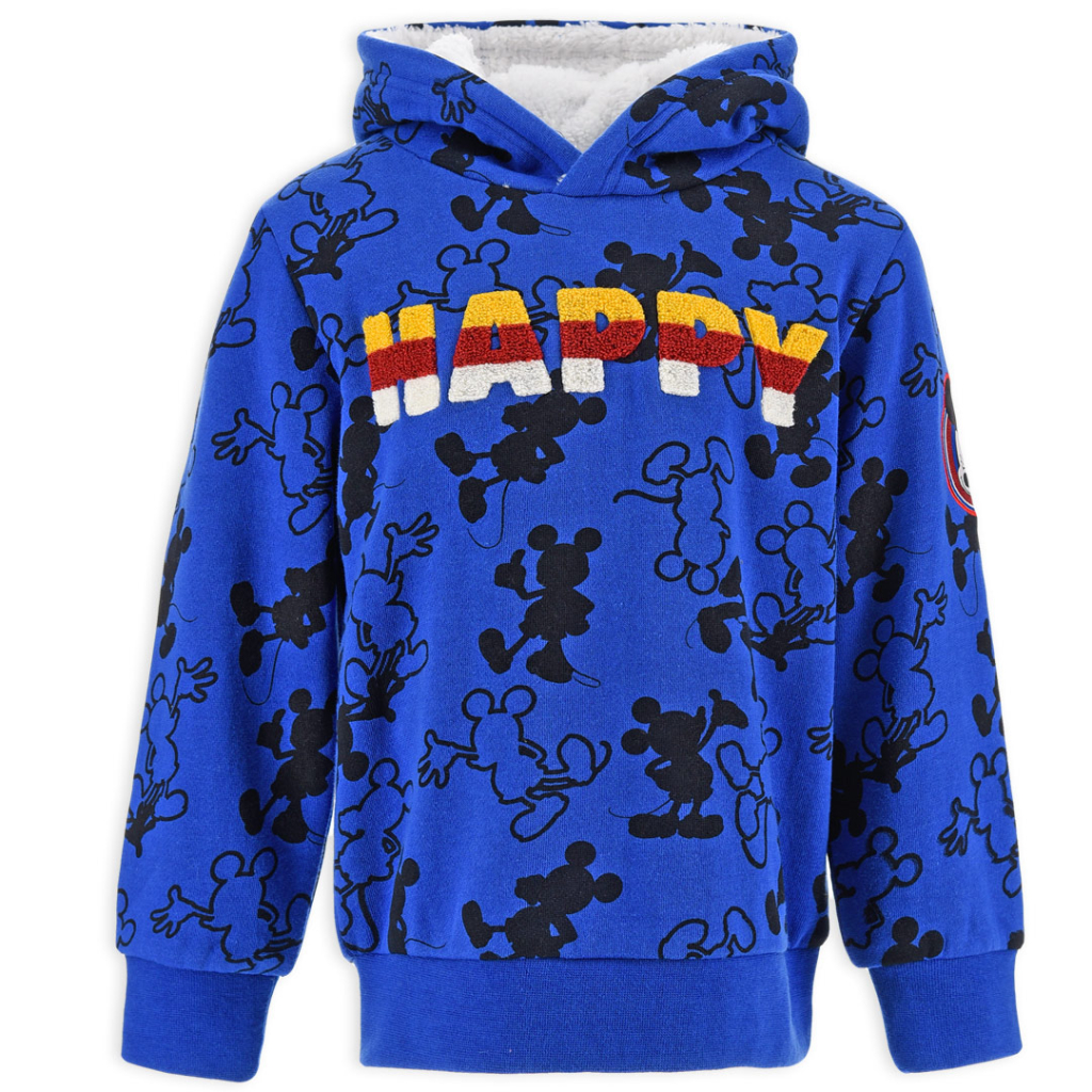 Detská mikina s celoplošnou potlačou Mickey Mouse. Našitý textilný nápis HAPPY. Kapucňa podšitá kožušinkou.
