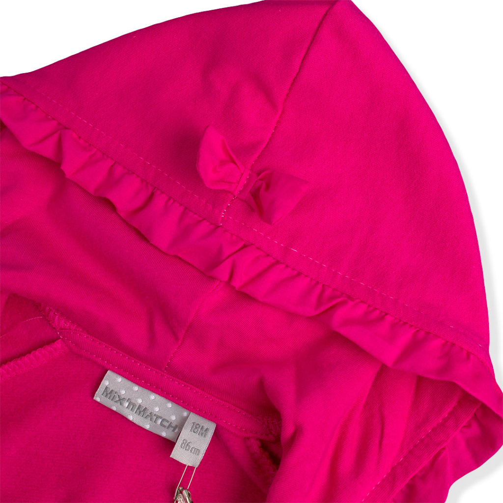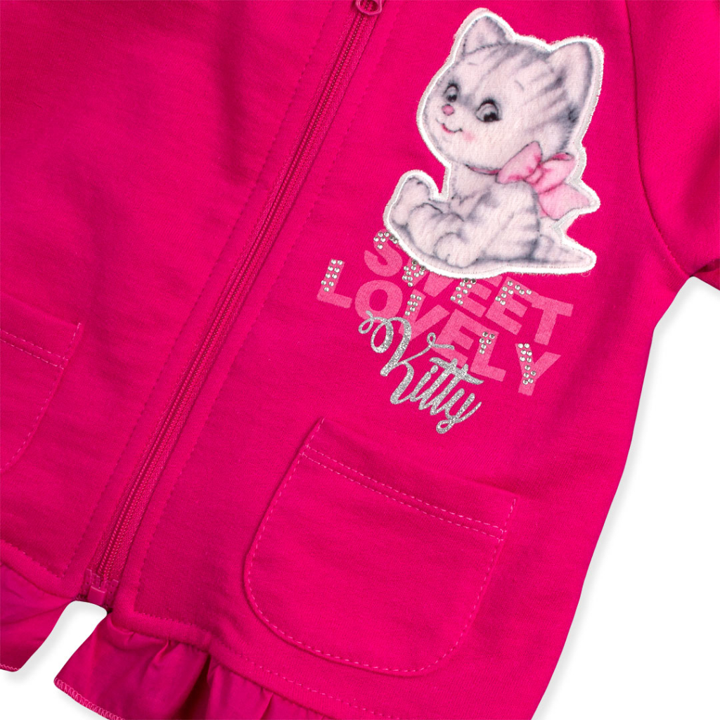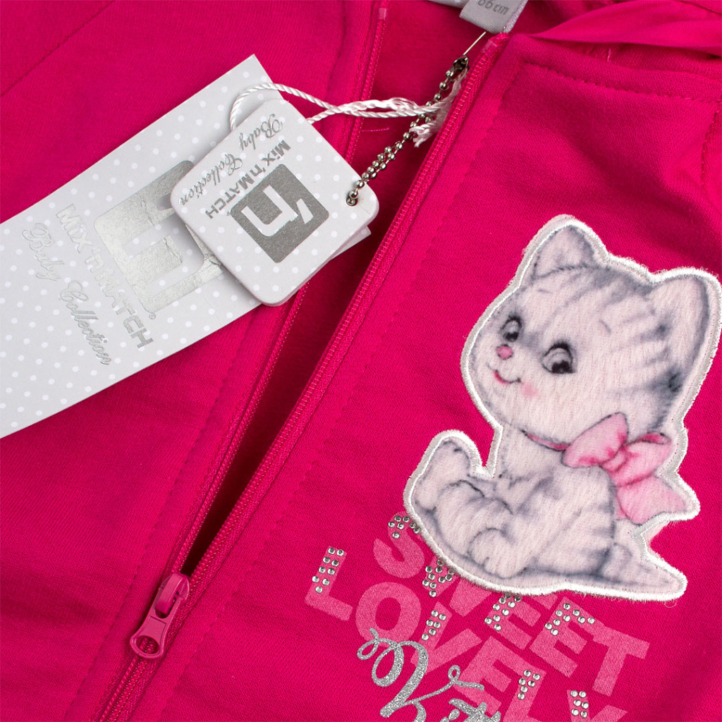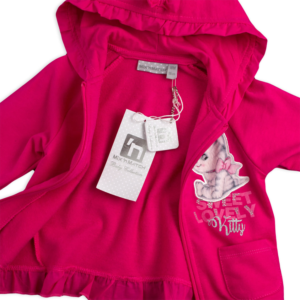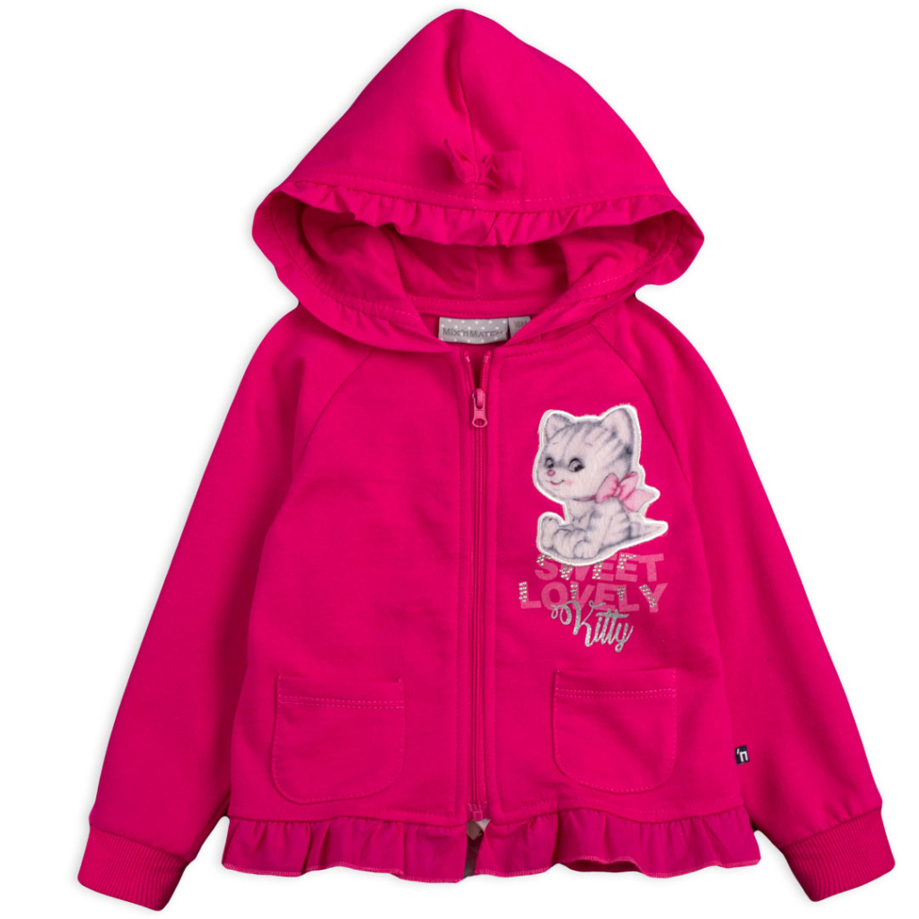 Mikina pre dievčatá. S kapucňou, zapínanie na zips. Našité vrecká, na spodnom okraji volánik. Utešený, hebký obrázok mačičky. Mäkký úplet, na rube česaná bavlna.Dodatočné parametre