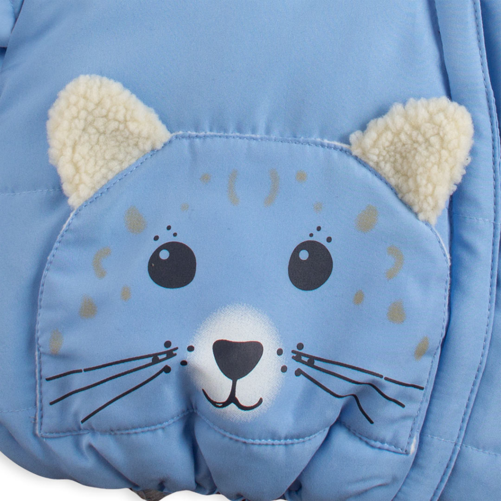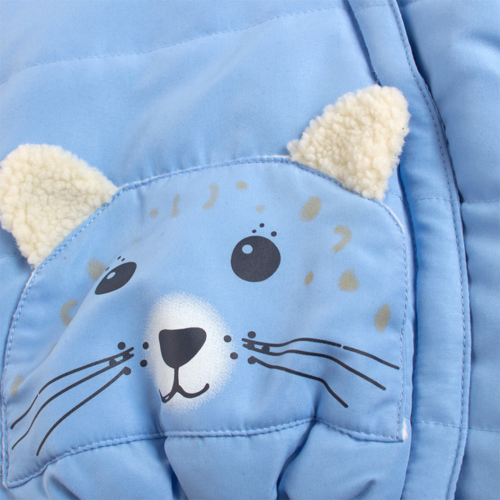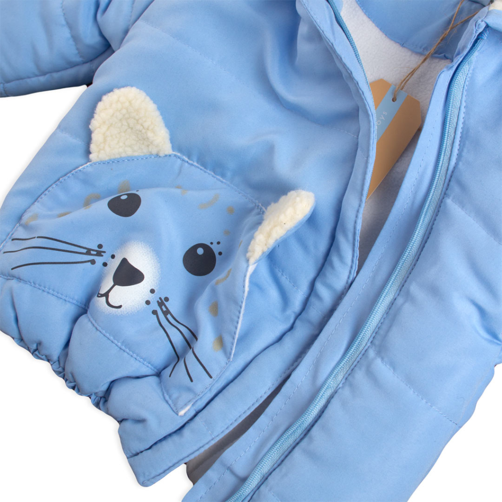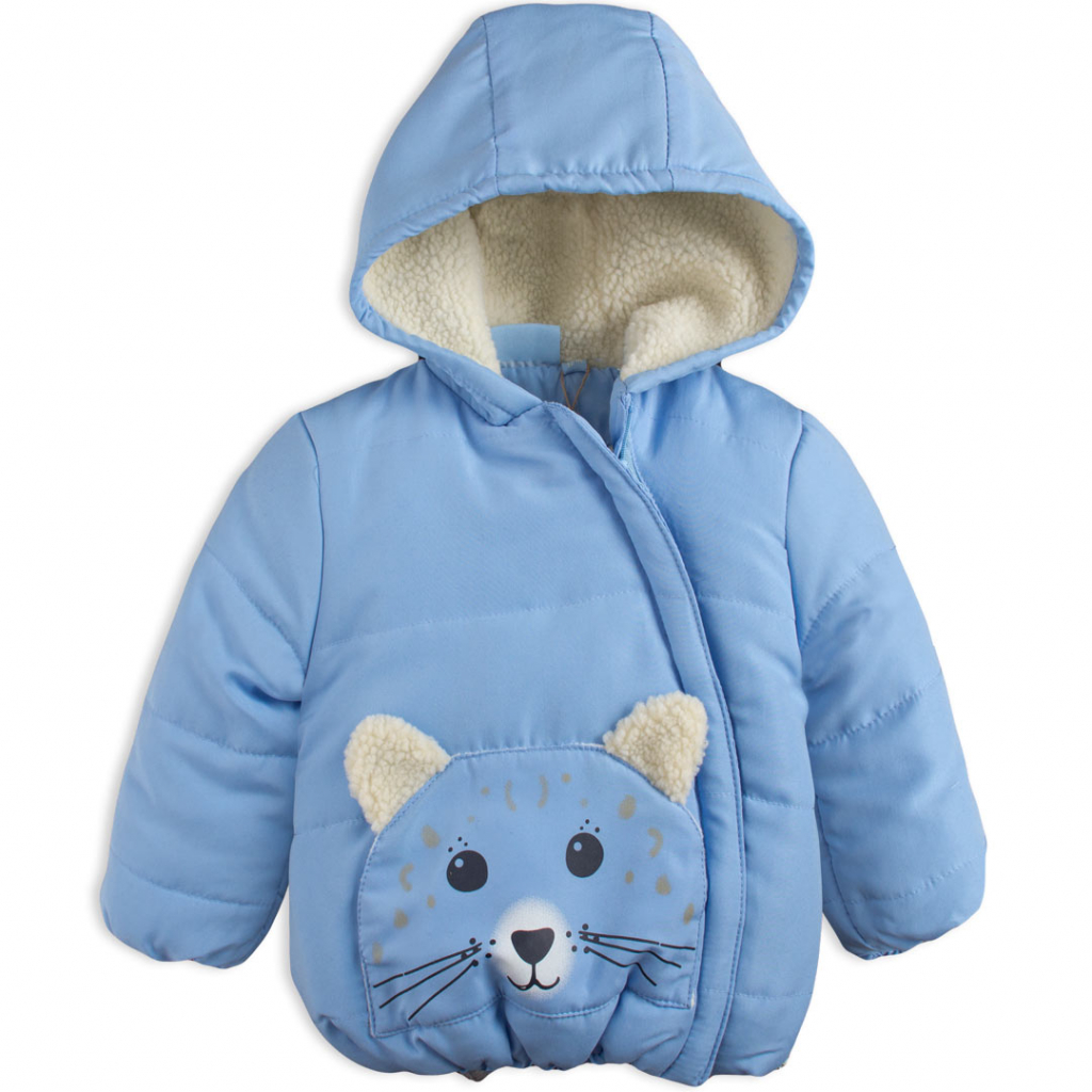 Detská bunda s kapucňou. Zapínanie na šikmý zips. Našité vrecko s roztomilou potlačou a uškami. Spodný okraj i rukávy do gumičky. Vo vnútri fleecová podšívka, v kapucni kožúšok. V rukávoch je šuštiak pre ľahšie obliekanie.Dodatočné parametre
