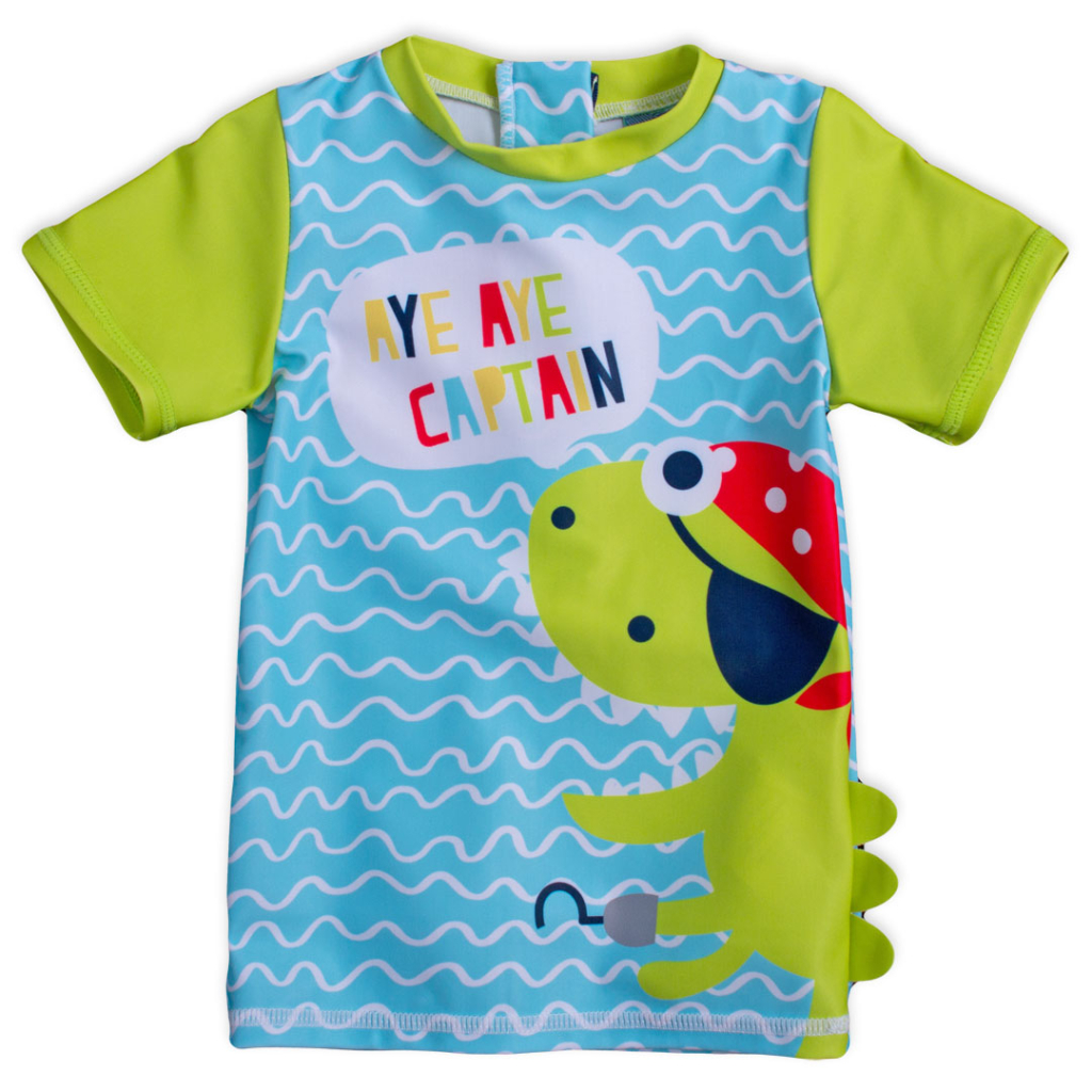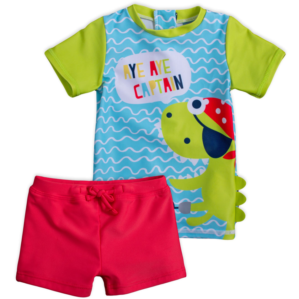 Dvojdielne detské plavky. Tričko s krátkym rukávom, zapínanie vzadu na zips. Šortky v páse na gumu, s ozdobnou šnúrkou.Dodatočné parametre