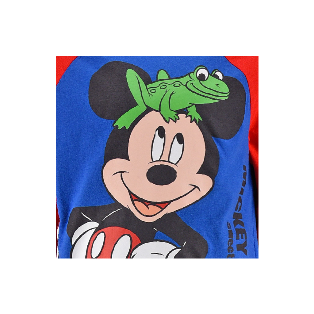 Detské pyžamo s Mickey Mousem. Vrchný diel s veľkou potlačou, nohavice s drobným vzorom. Rukávy a nohavice zakončené patentom.Dodatočné parametre