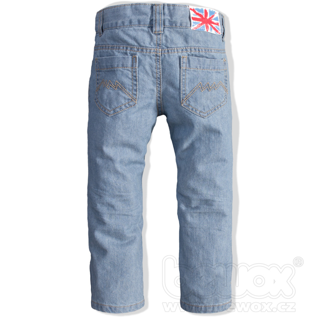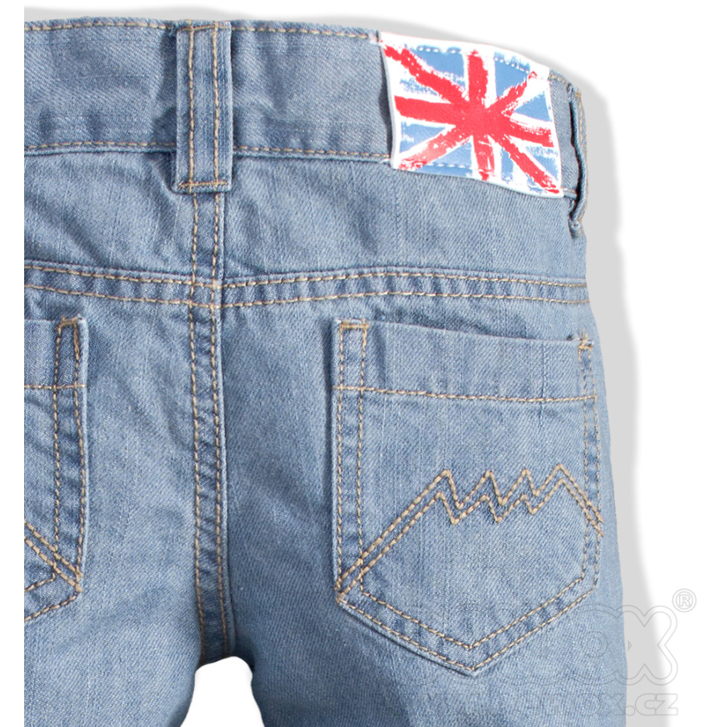Detské rifle z klasickej džínsoviny svetlej farby. Prešívané vrecká vpredu i vzadu. Rovný strih nohavíc. V páse gombík a guma na stiahnutie.Dodatočné parametre