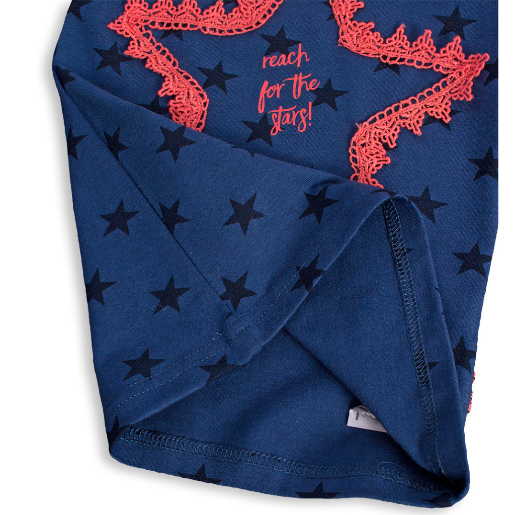 Tričko s krátkym rukávom pre dievčatká. Bavlnený úplet s potlačou hviezdičiek. Našitá aplikácia vpredu. Na ramene zapínanie na patentky. Na boku malá nášivka. Príjemný materiál.