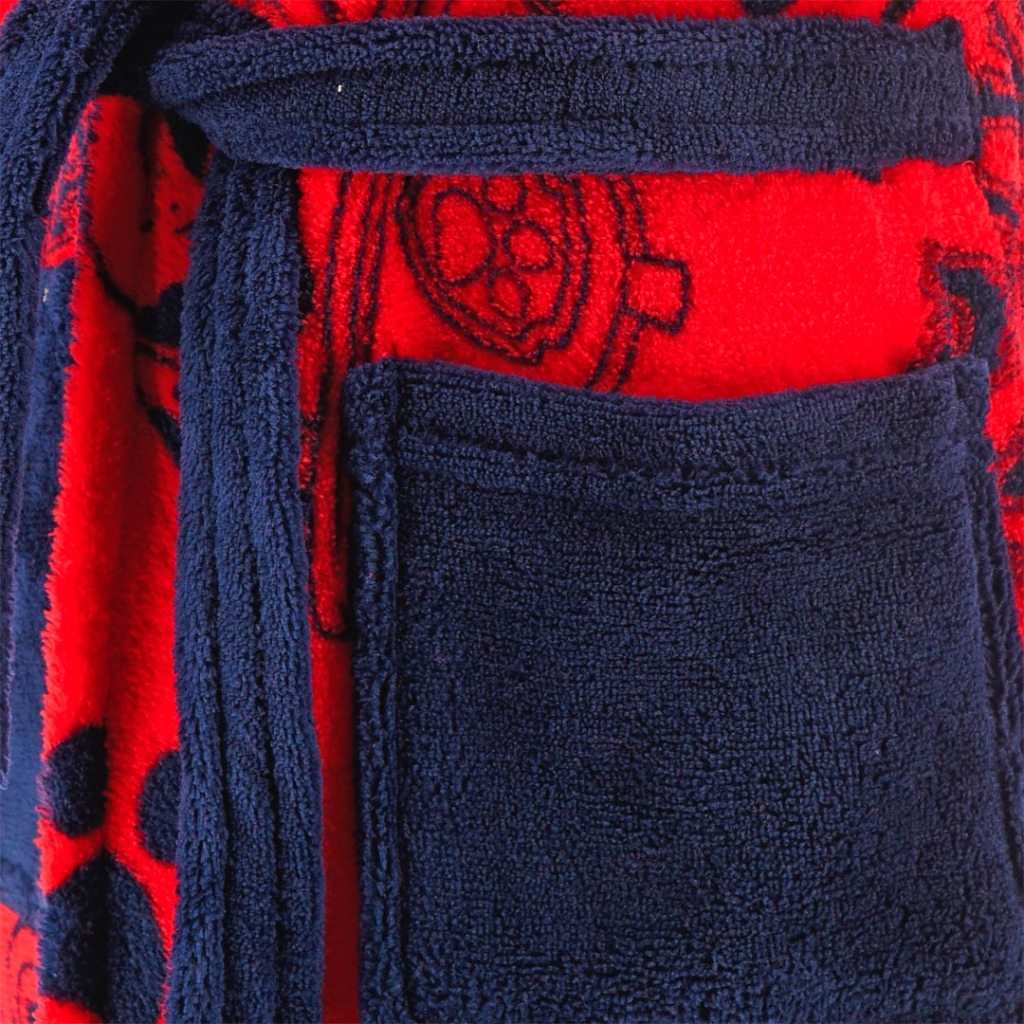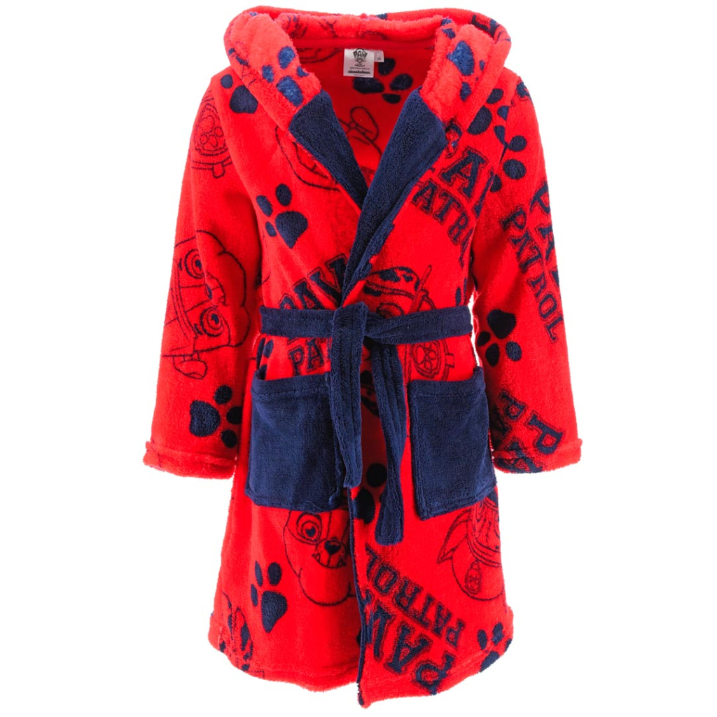 Detský župan s Labkovou patrolou. V páse v zadnej časti guma. Opasok všitý na bokoch. Praktické vrecká. Jemný, hebký materiál.Dodatočné parametre