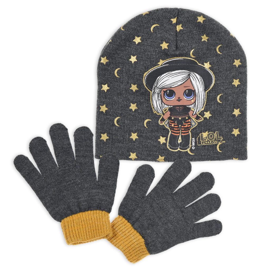 Krásny set pre dievčatá - čiapka s bábikou L.O.L.SURPRISE, so zlatou potlačou. Prstové rukavice s okrajom zdobeným zlatou nitkou.Dodatočné parametre