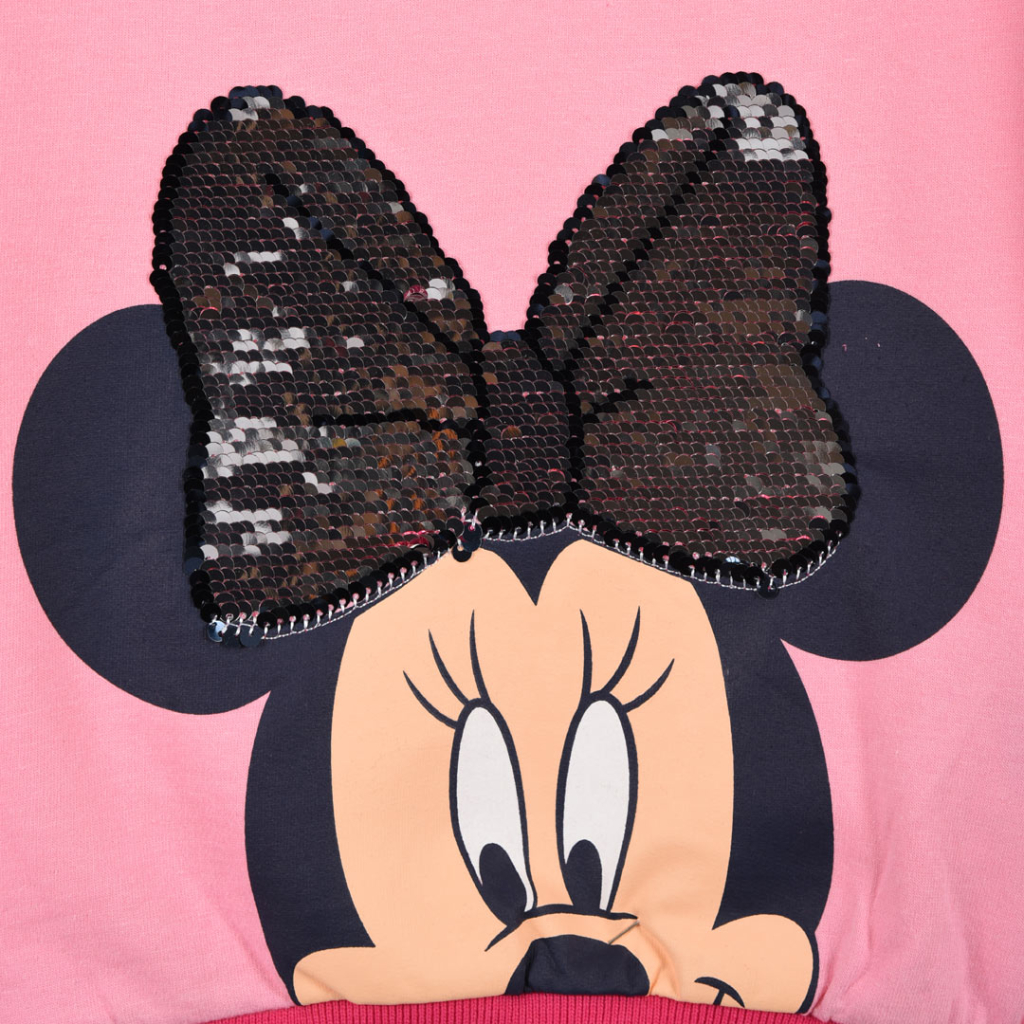 Dievčenská mikina s Minnie s mašľou z preklápacích flitrov. Drobná potlač aj na zadnom diele, patenty s lurexovou nitkou. Bavlnená teplákovina na rube bez chĺpku.Dodatočné parametre