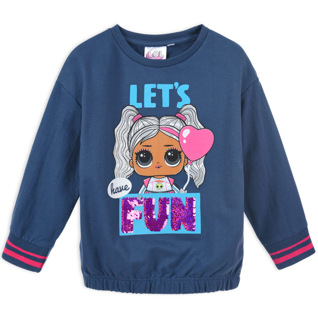 Dievčenská mikina bez kapucne. Farebný obrázok L.O.L.SURPRISE. Nápis z preklápacích flitrov. Rukávy s pružným lemom, spodný okraj mikiny do gumy. Príjemný materiál, na rube bez chĺpku.Dodatočné parametre