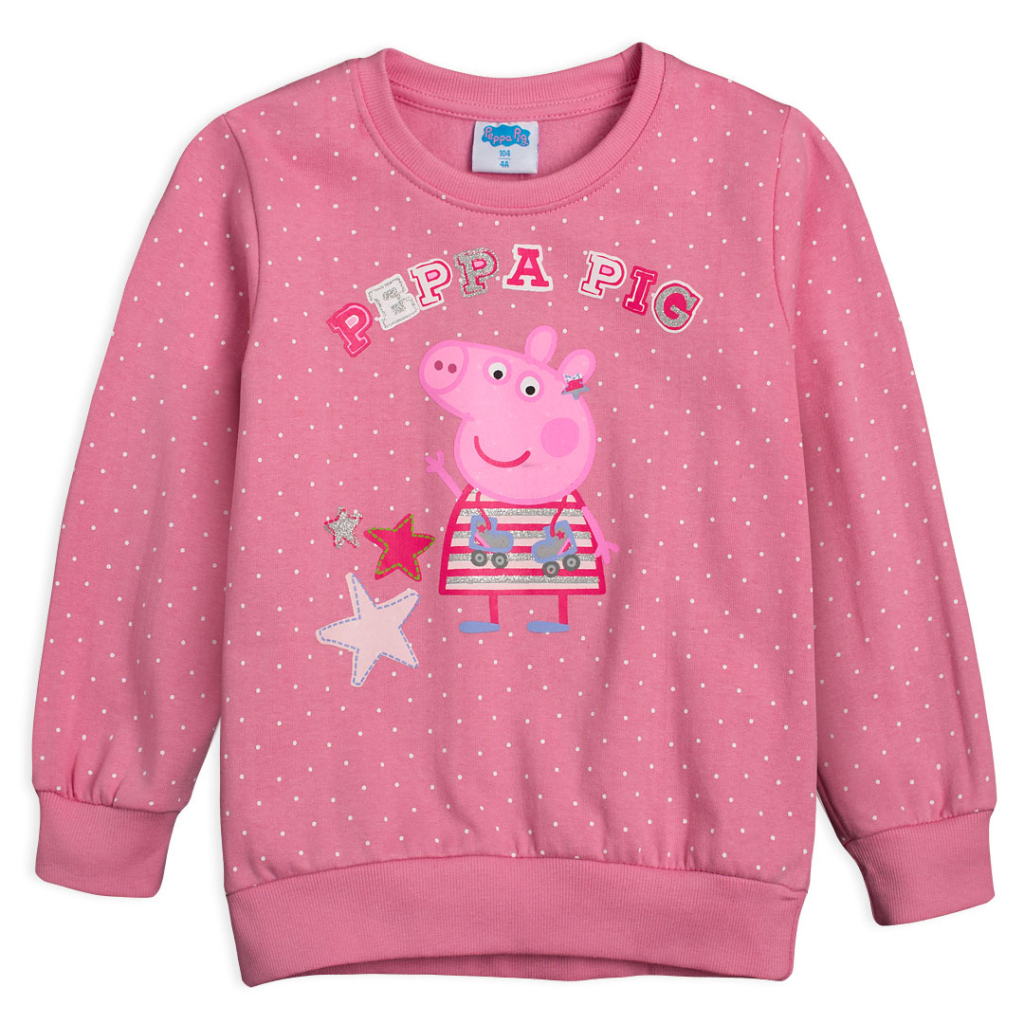 Dievčenská mikina bez kapucne. S prasiatkom Peppou a drobnými bodkami. Príjemný materiál, teplákovina s jemným chĺpkom na rubovej strane.Dodatočné parametre