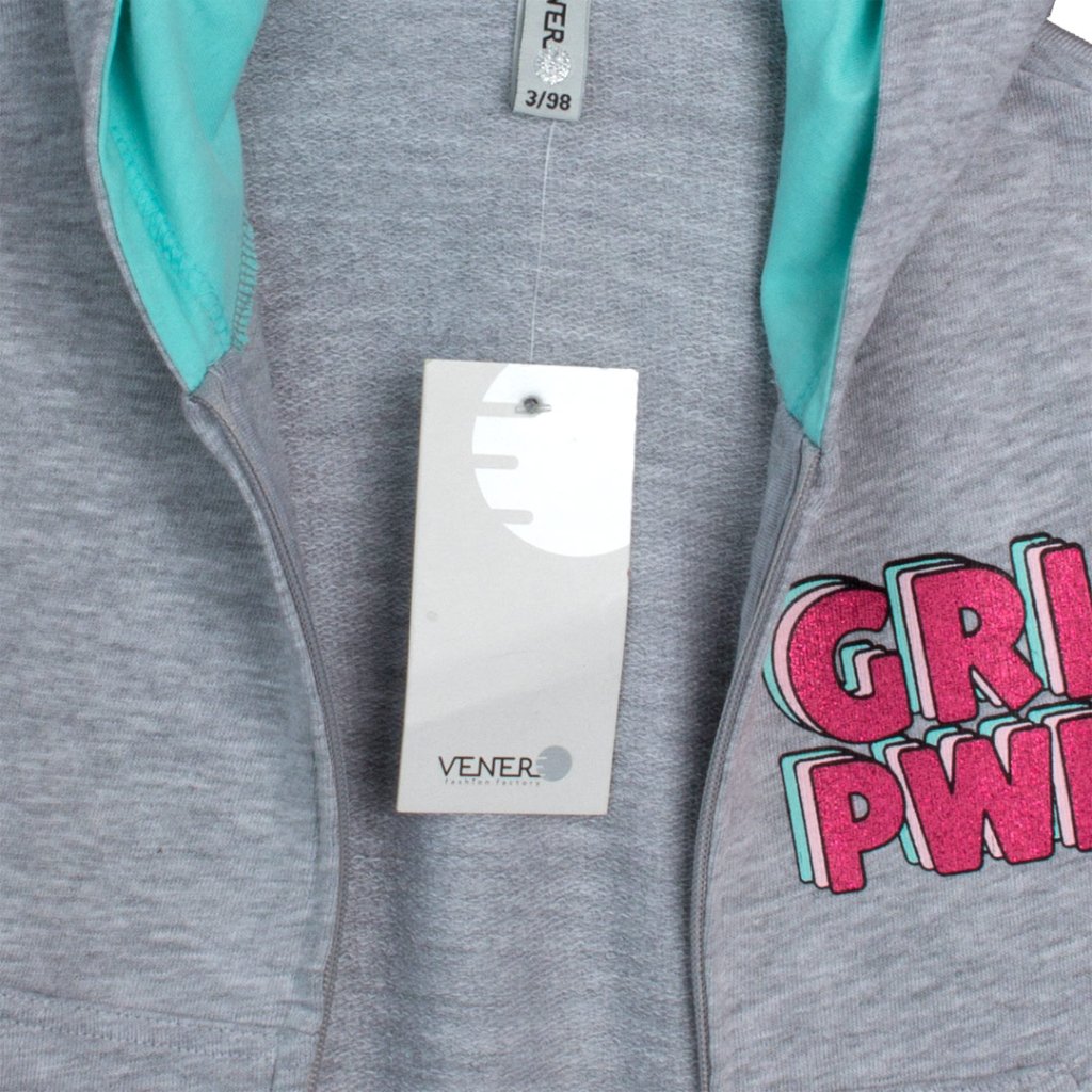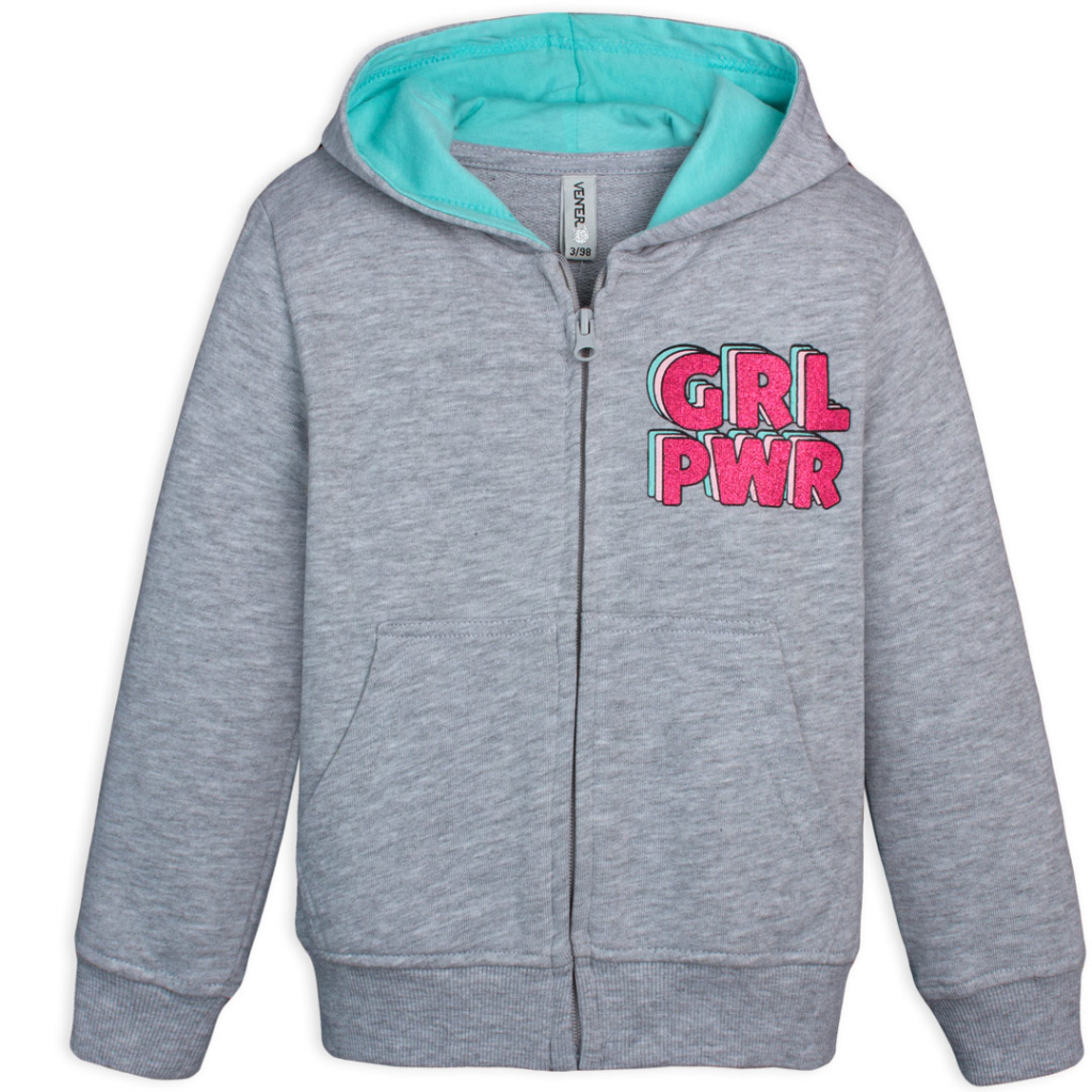 Dievčenská rozopínacia mikina s kapucňou. Vpredu našité vrecká. Trblietavá potlač. Teplákovina na rube bez chĺpku.