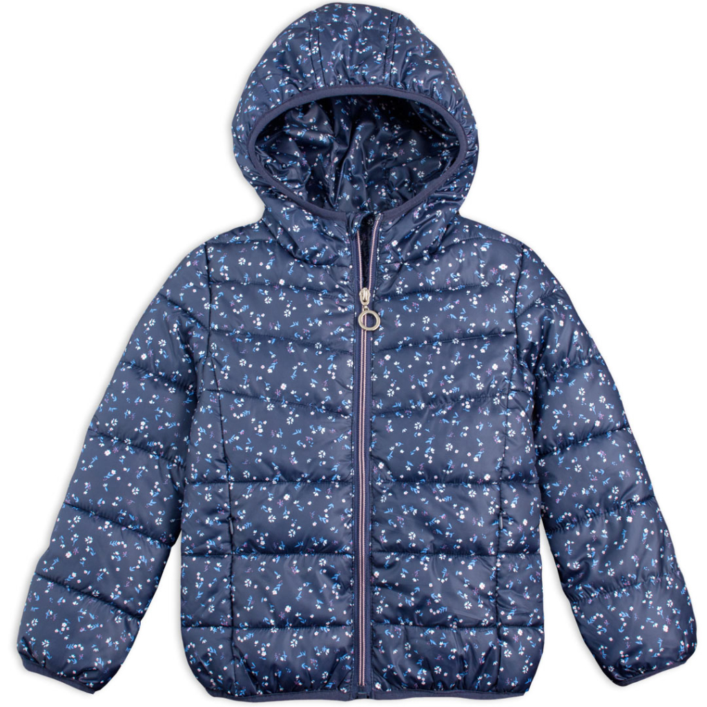 Prešívaná dievčenská bunda pre prechodné obdobie. S kapucňou, hlboké vrecká na zips. Jemná potlač kvetiniek. Šuštiaková podšívka.Dodatočné parametre