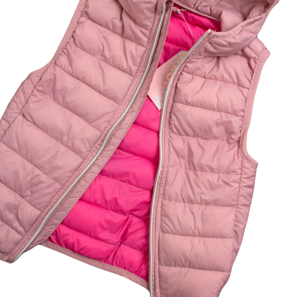 Ľahká dievčenská prešívaná vesta bez potlače. S kapucňou, stojačik pri krku. Hlboké vrecká.Dodatočné parametre