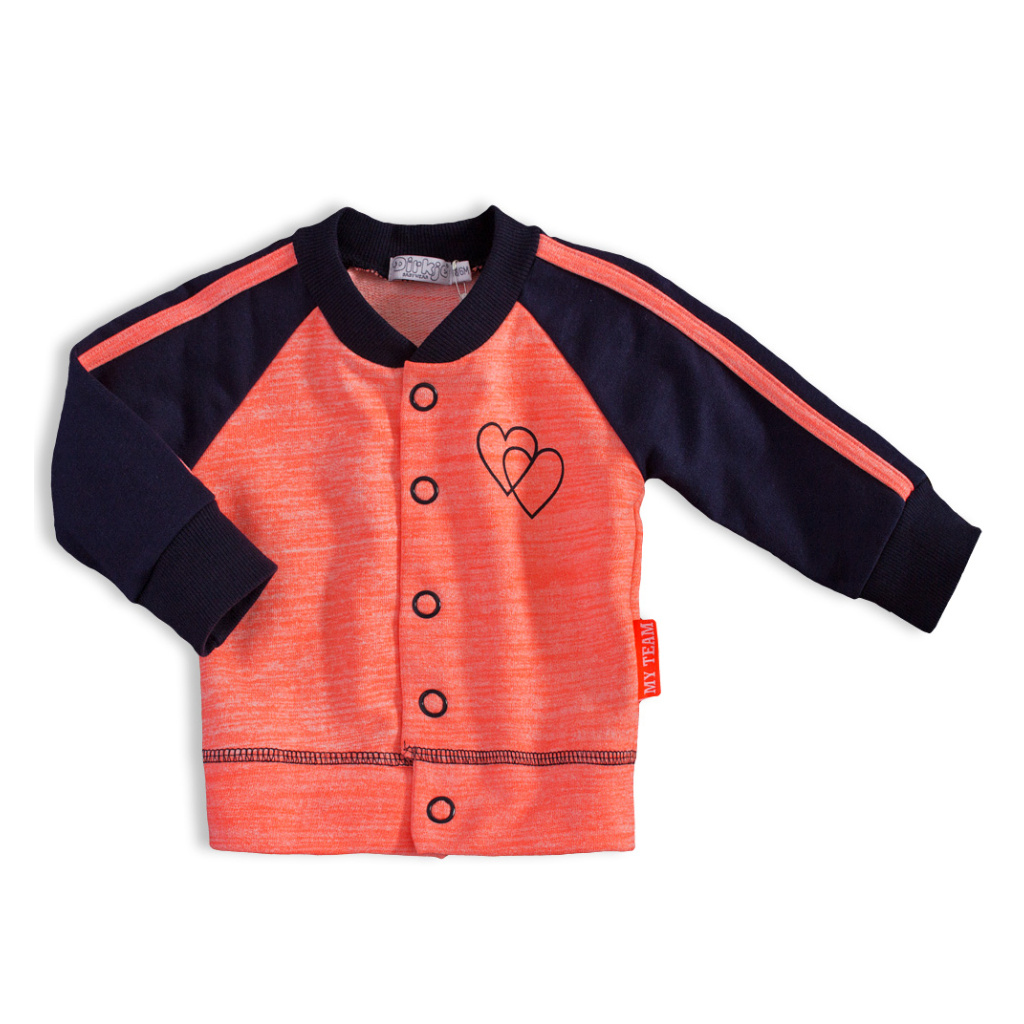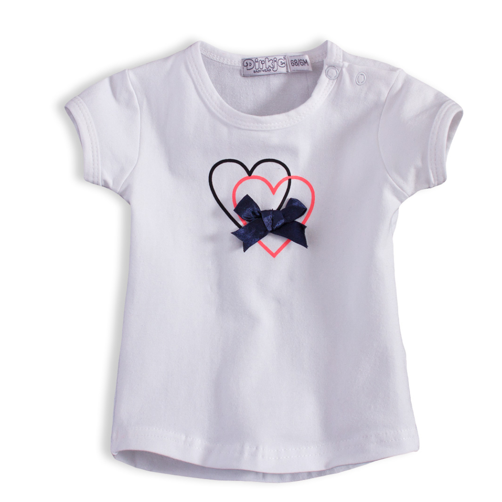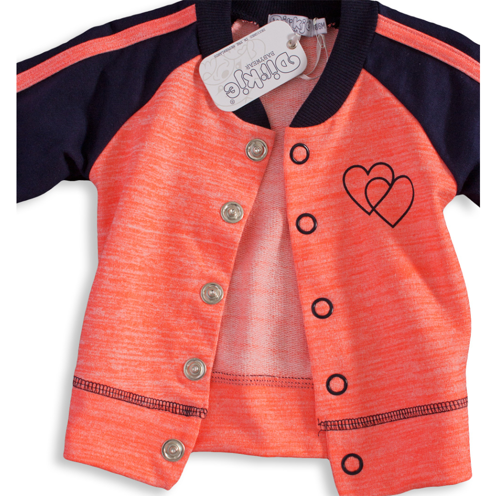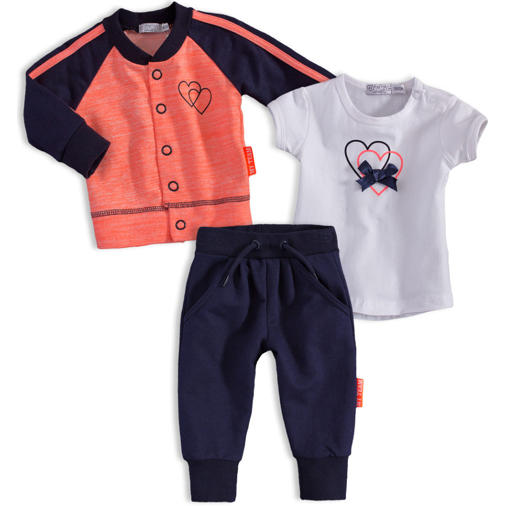 Dievčenská mikina bez kapucne, zapínanie na patenty. Tepláky s vreckami, v páse guma, šnúrka prišitá. Tričko s krátkym rukávom, s potlačou a našitou mašličkou. Na ramene zapínanie na patentky. Mäkký, príjemný úplet.Dodatočné parametre