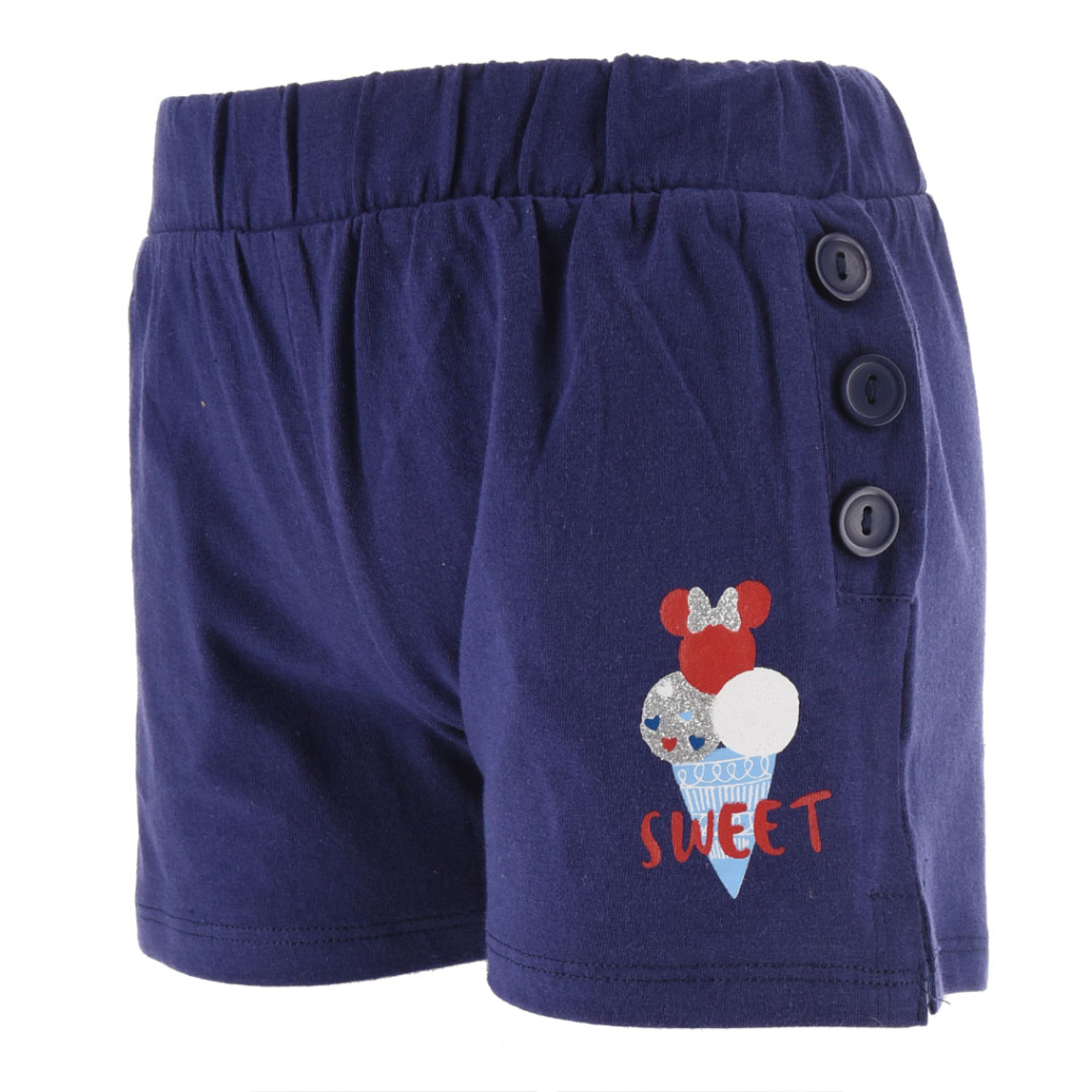Dievčenská letná súprava s myškou Minnie. Tričko s krátkym rukávom, s potlačou a flitrami. Pohodlné šortky v páse na gumu. Na bokoch vrecká zdobené gombíkmi. Príjemný bavlnený úplet.Dodatočné parametre