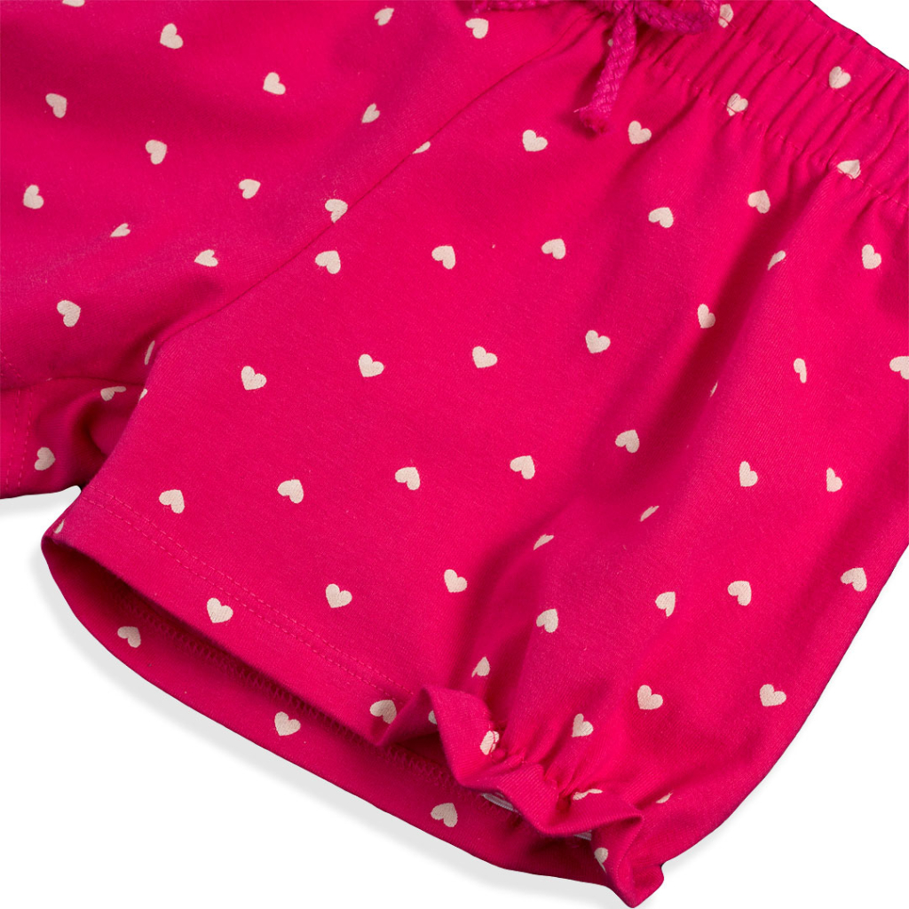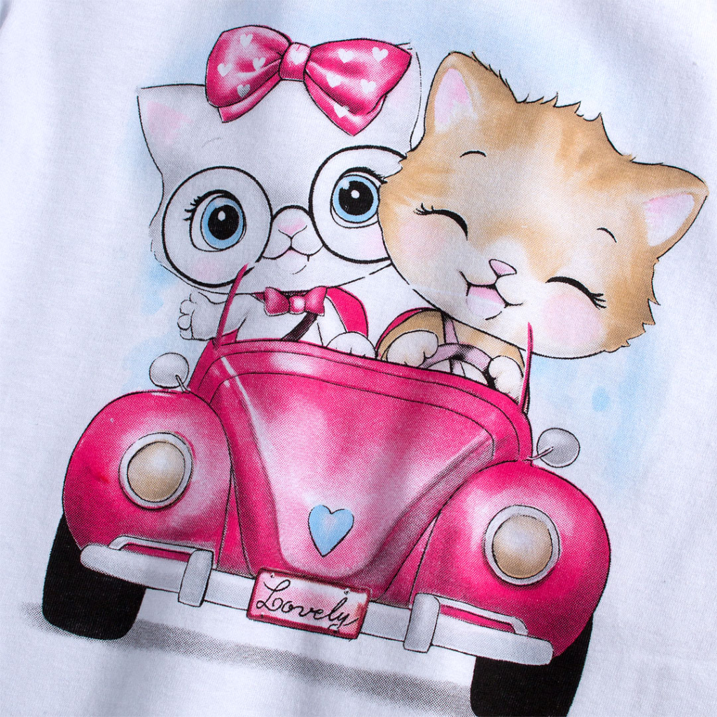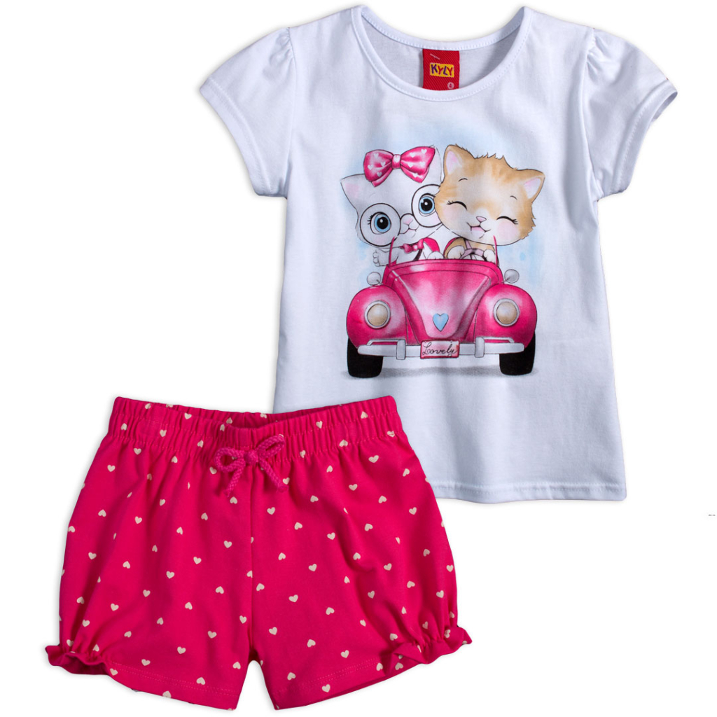 Letná súprava pre dievčatká. Tričko s krátkym rukávom, s roztomilým obrázkom mačičiek. Šortky s drobnými srdiečkami, v páse na gumu. Príjemný, mäkký materiál. Vyrobené v Brazílii.Dodatočné parametre