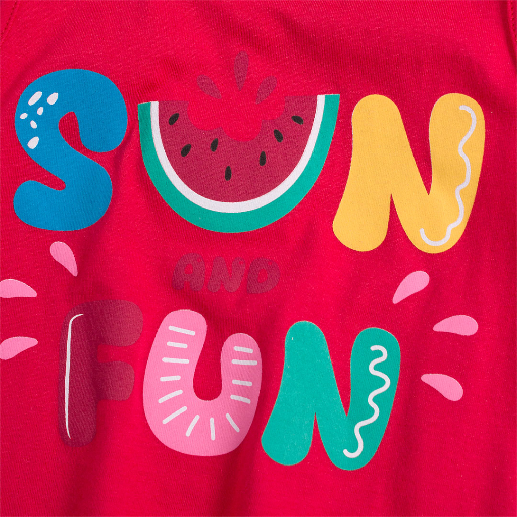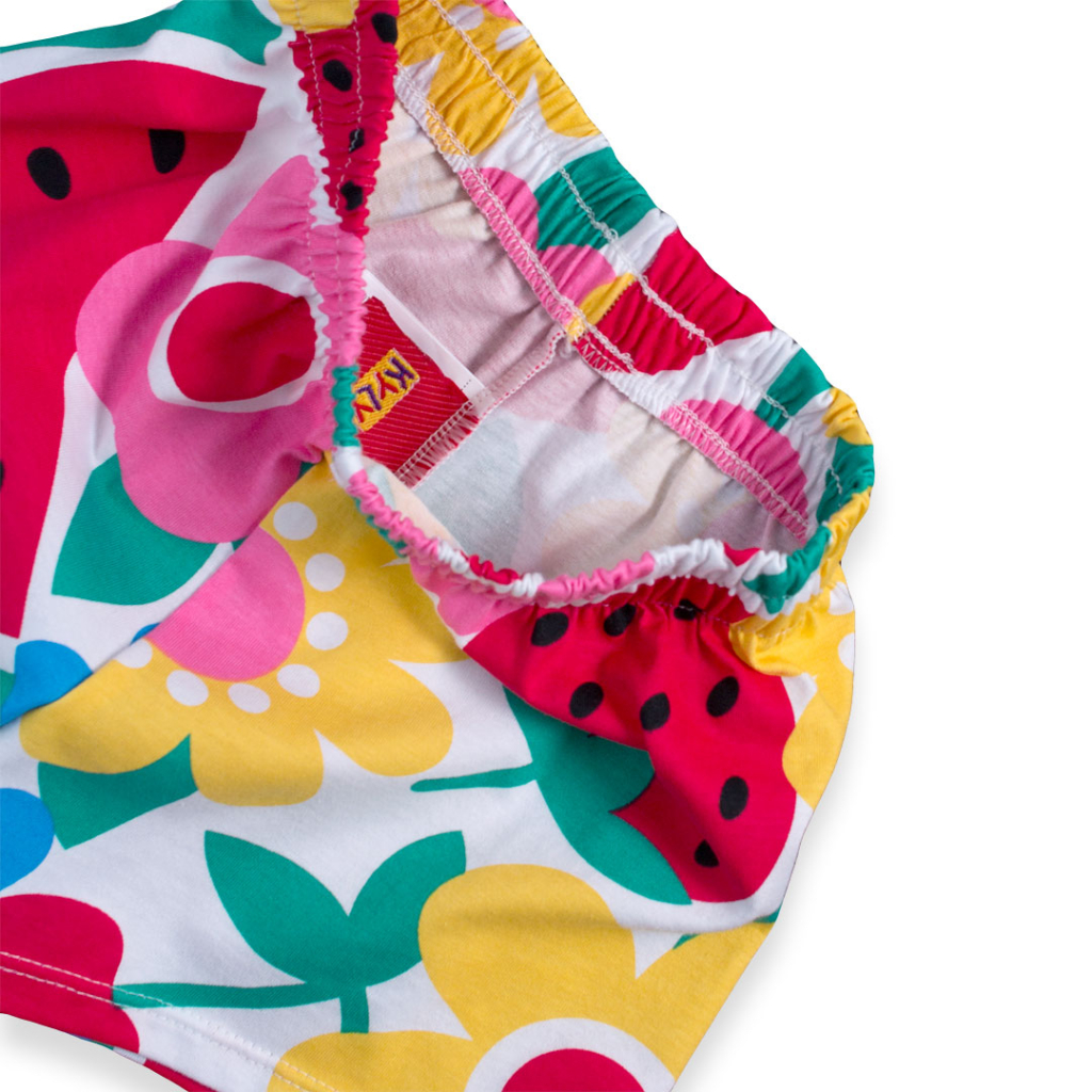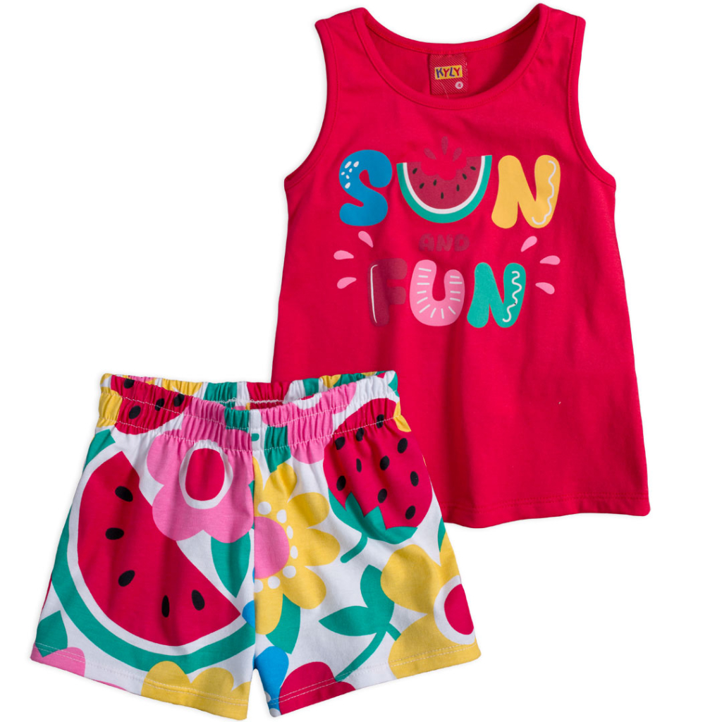 Dievčenská letná súprava. Tričko bez rukávov a pohodlné šortky na gumu. Farebná potlač na bavlnenom úpletu. Vyrobené v Brazílii.