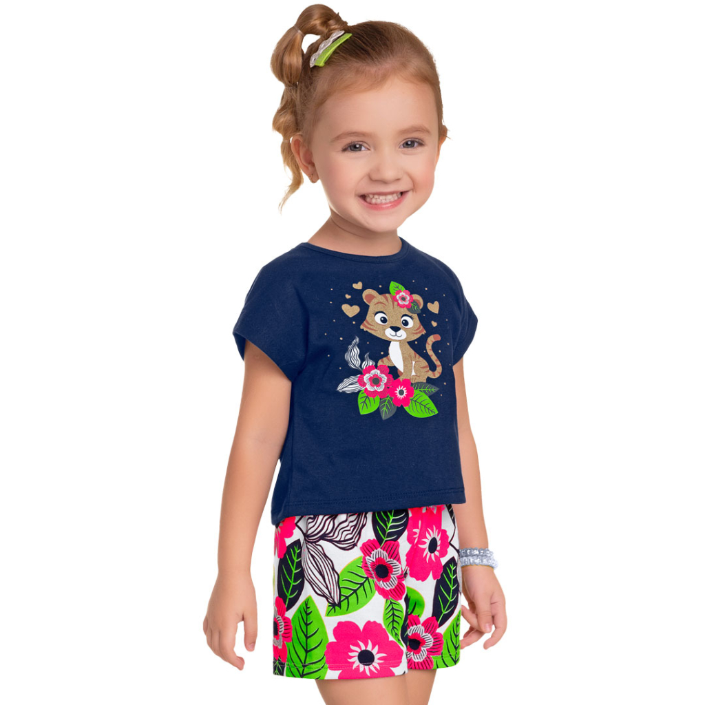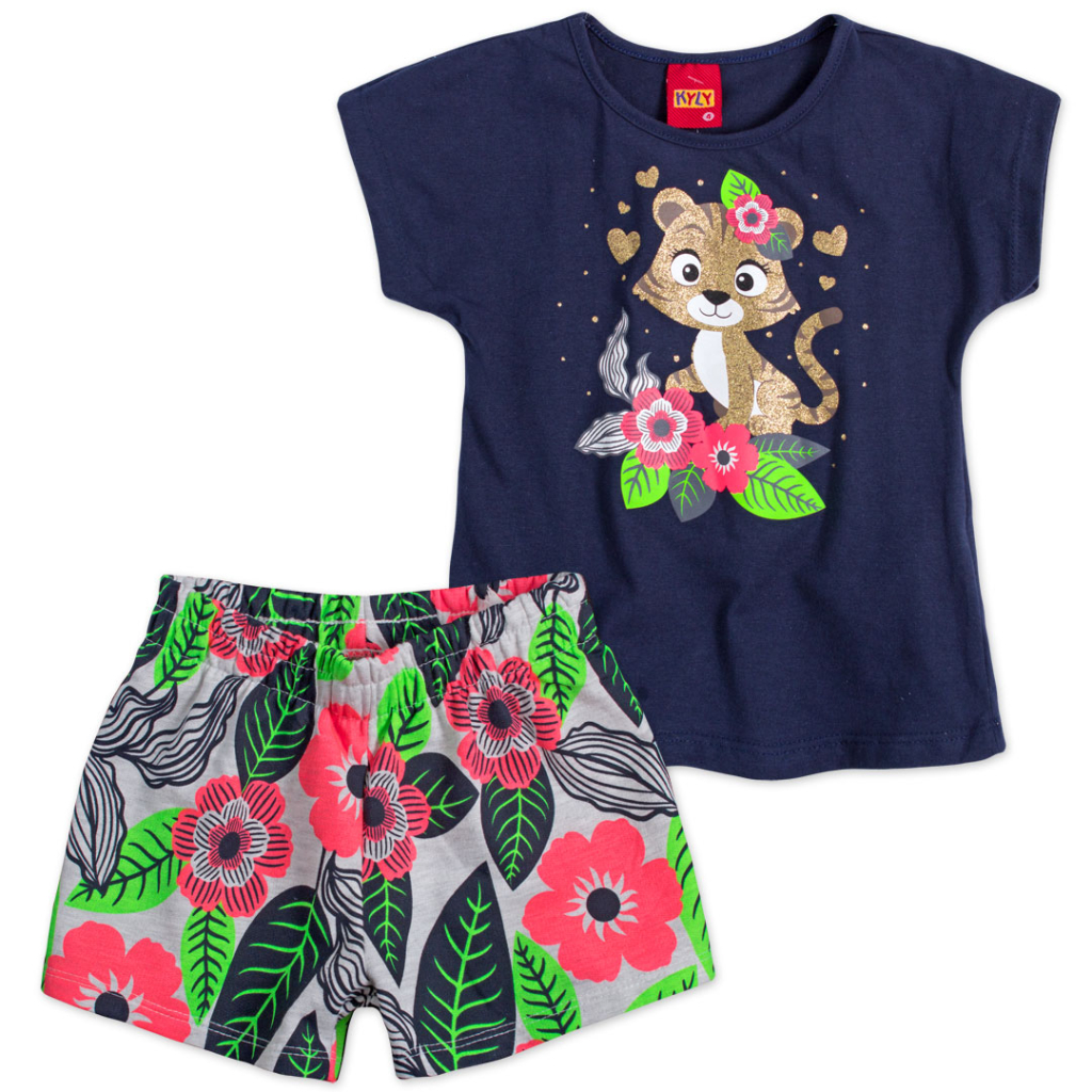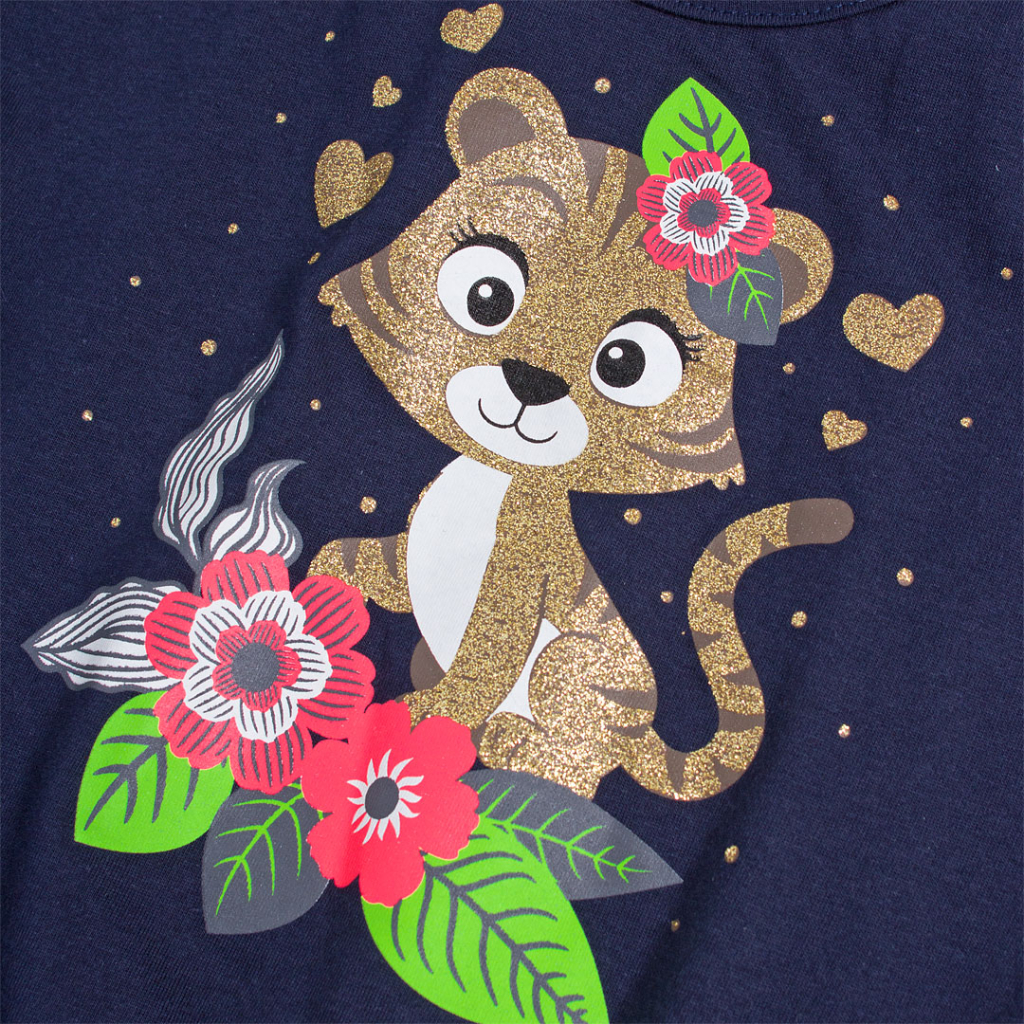 Dievčenská letná súprava - tričko s krátkym rukávom, s trblietavou potlačou tigríka. Pohodlné šortky v páse na gumu. Vyrobené v Brazílii.Dodatočné parametre