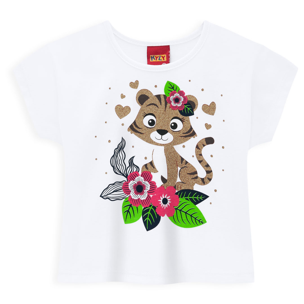 Dievčenská letná súprava - tričko s krátkym rukávom, s trblietavou potlačou tigríka. Pohodlné šortky v páse na gumu. Vyrobené v Brazílii.Dodatočné parametre