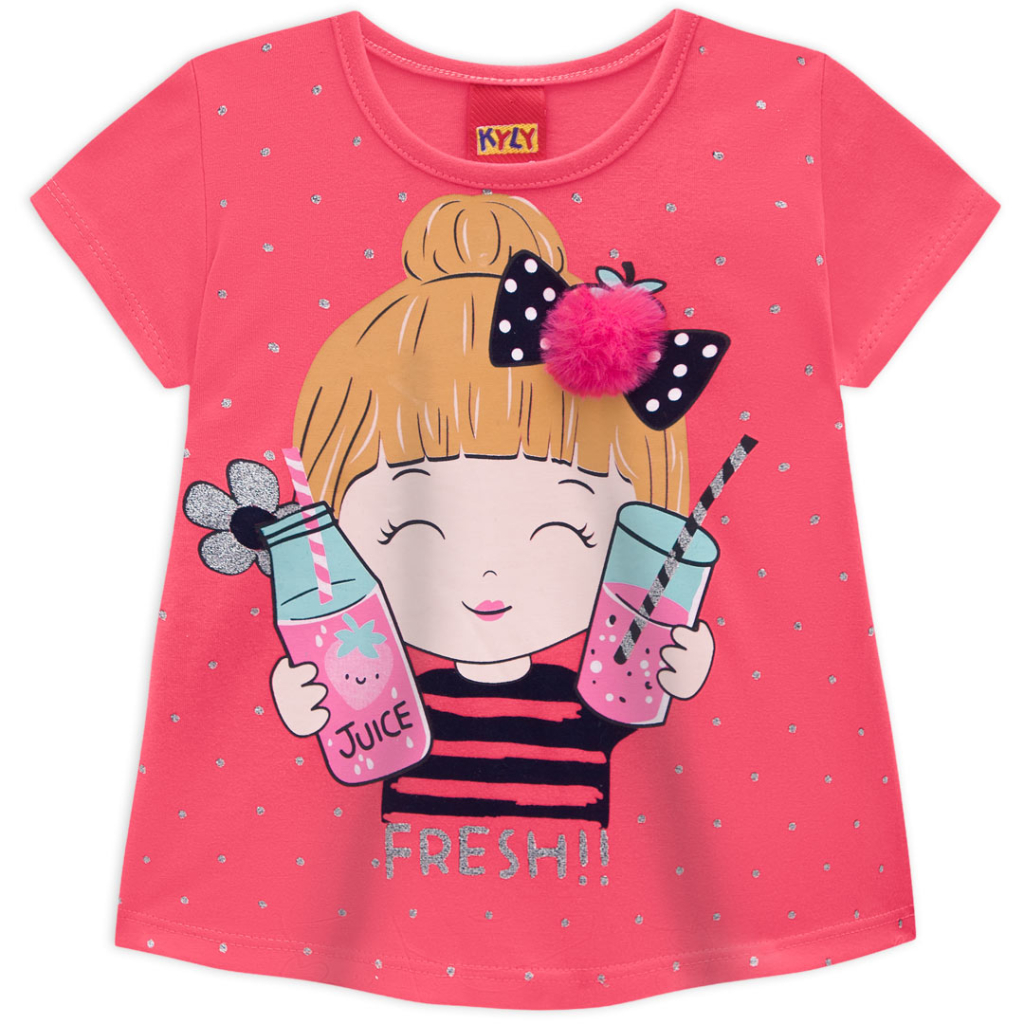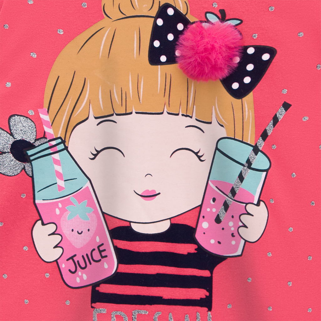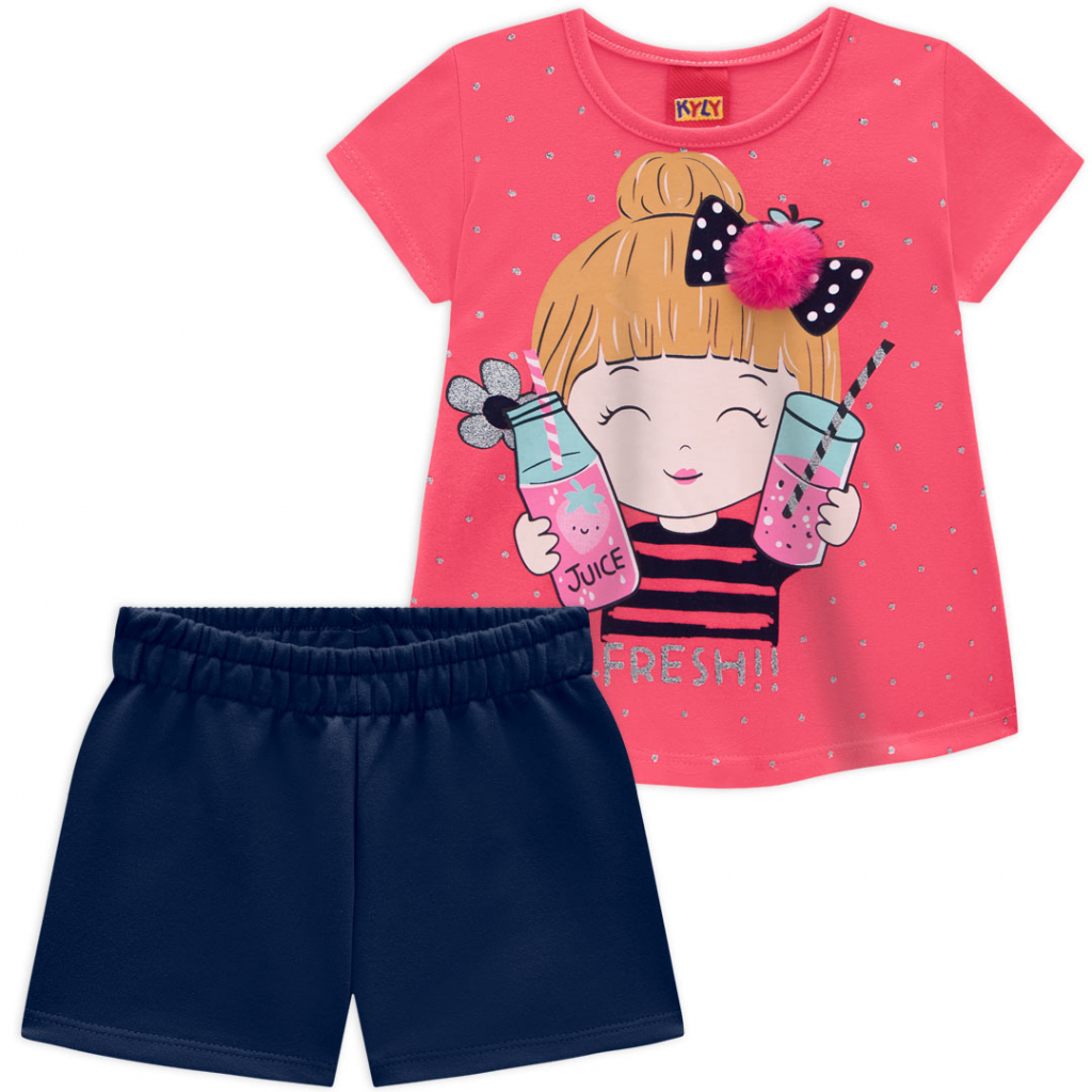 Krásna letná súprava pre dievčatá. Tričko s krátkym rukávom, okrúhly výstrih, mierne rozšírený strih. Vpredu farebná potlač so striebornými detailmi. Jednofarebné šortky z teplákoviny. Príjemný, mäkký materiál. Vyrobené v Brazílii.Dodatočné parametre