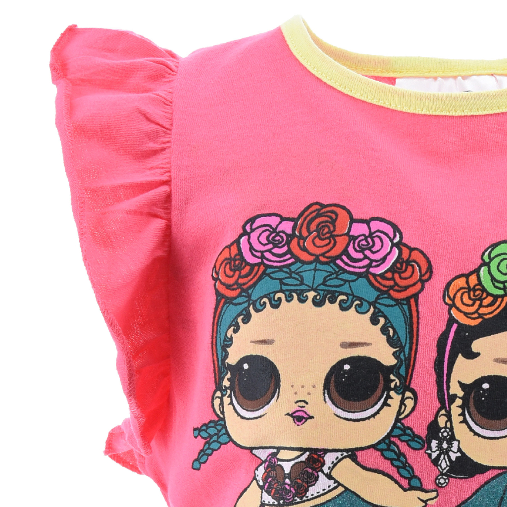 Dievčenská letná súprava - tričko bez rukávov, s našitým volánikom. Veľký, farebný obrázok bábik L.O.L.SURPRISE. Šortky bez potlače, v páse na gumu, s malými ozdobnými mašličkami na nohaviciach. Pružný bavlnený úplet.Dodatočné parametre