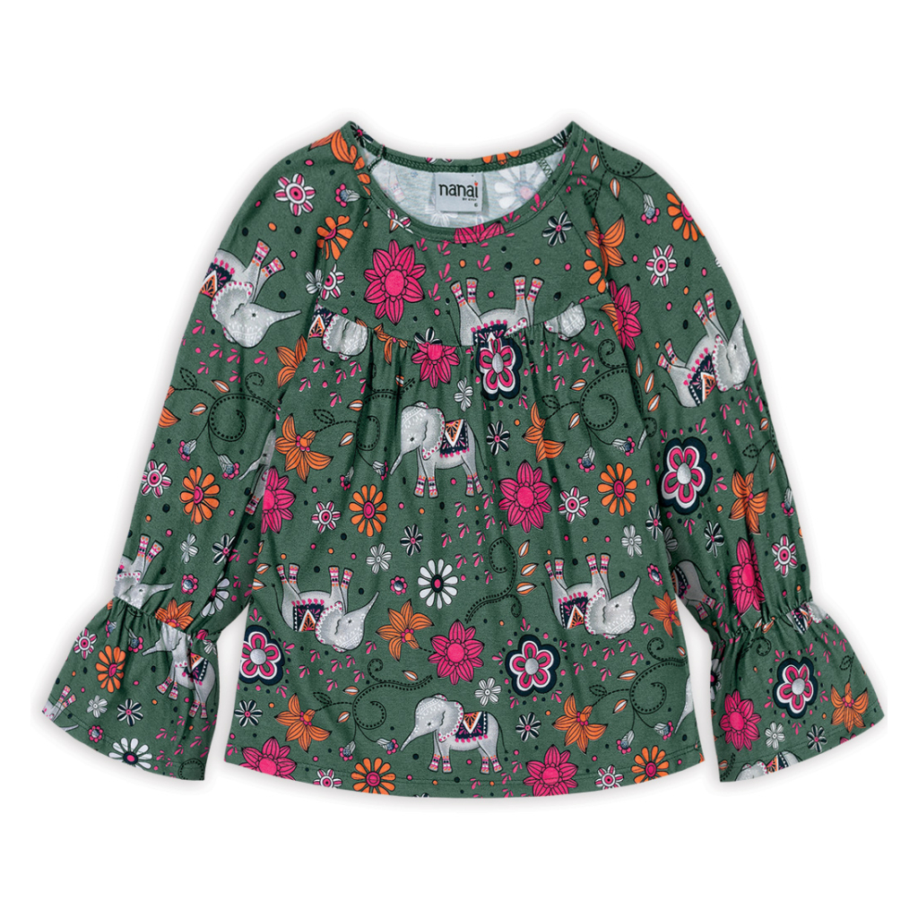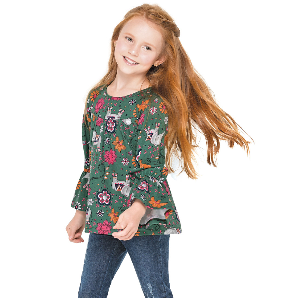 Štýlová dievčenská tunika s dlhým rukávom. Mierne rozšírený strih. Vpredu sedlo s riasením. Na konci rukávov našitý trendy volán. Bavlnený úplet s potlačou.